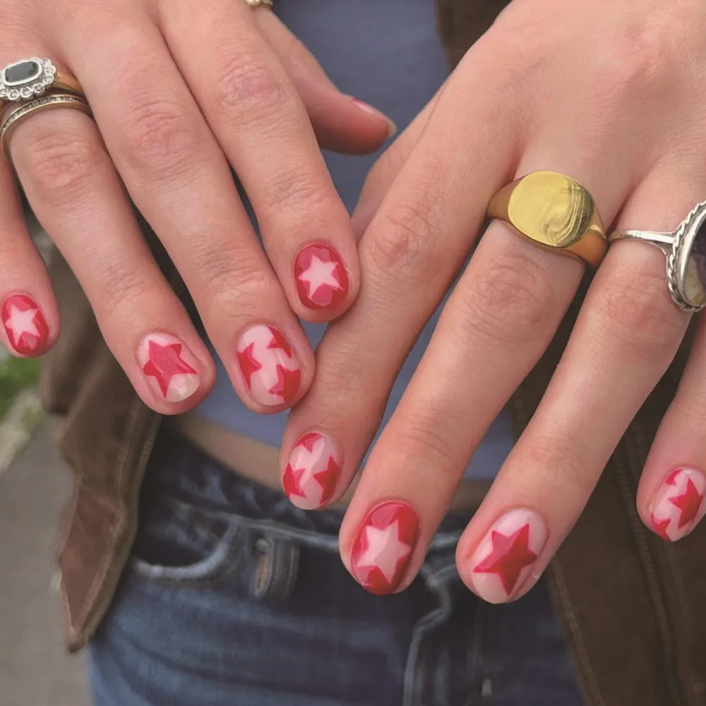 24 Star Designs On Nails | Red Five-pointed Star Designs Short Square Fake Nails