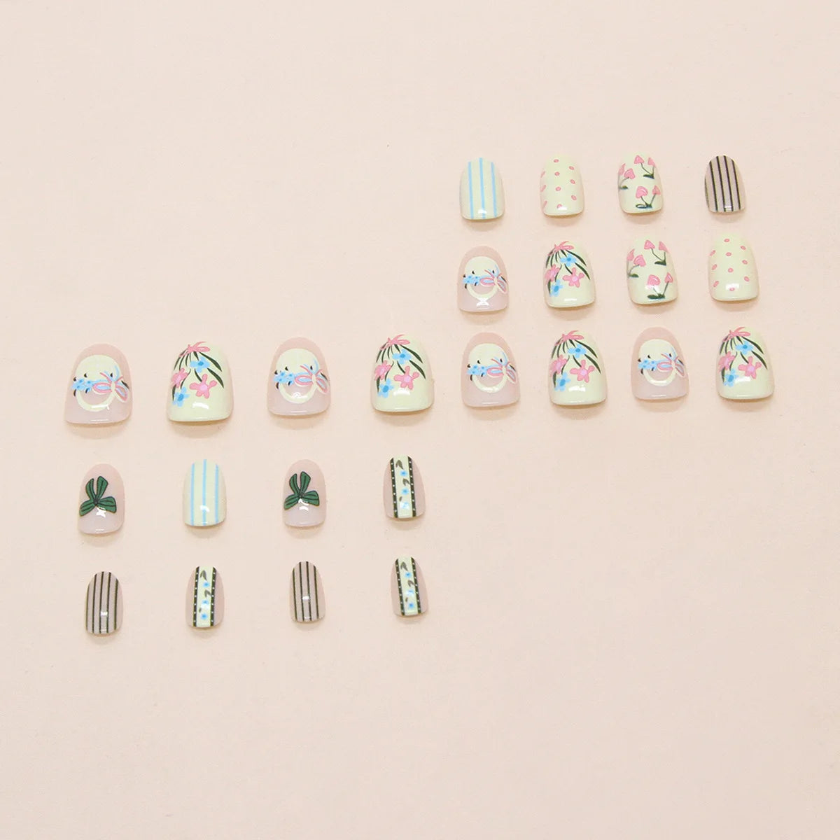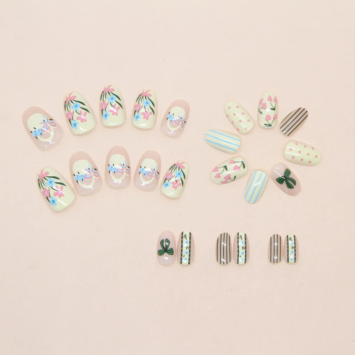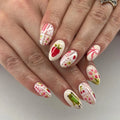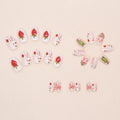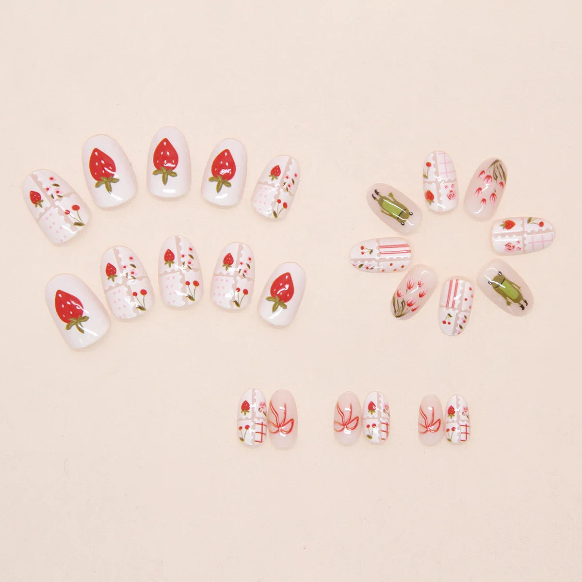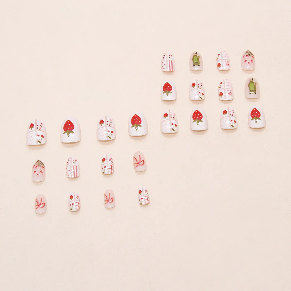 Strawberry Cherry Nails | Short Round Head Fake Nails | Sweet Strawberry Cherry Flower Bowknot | 24 Nails for Girls