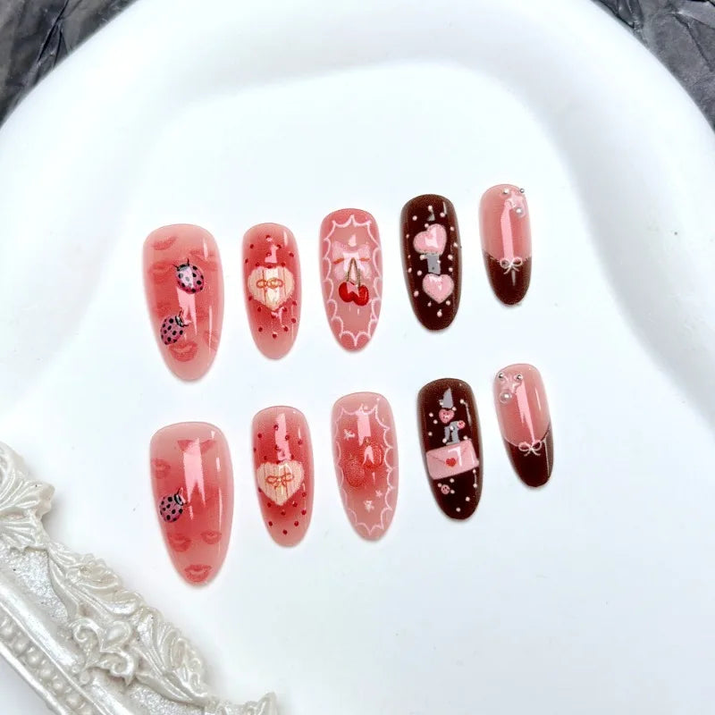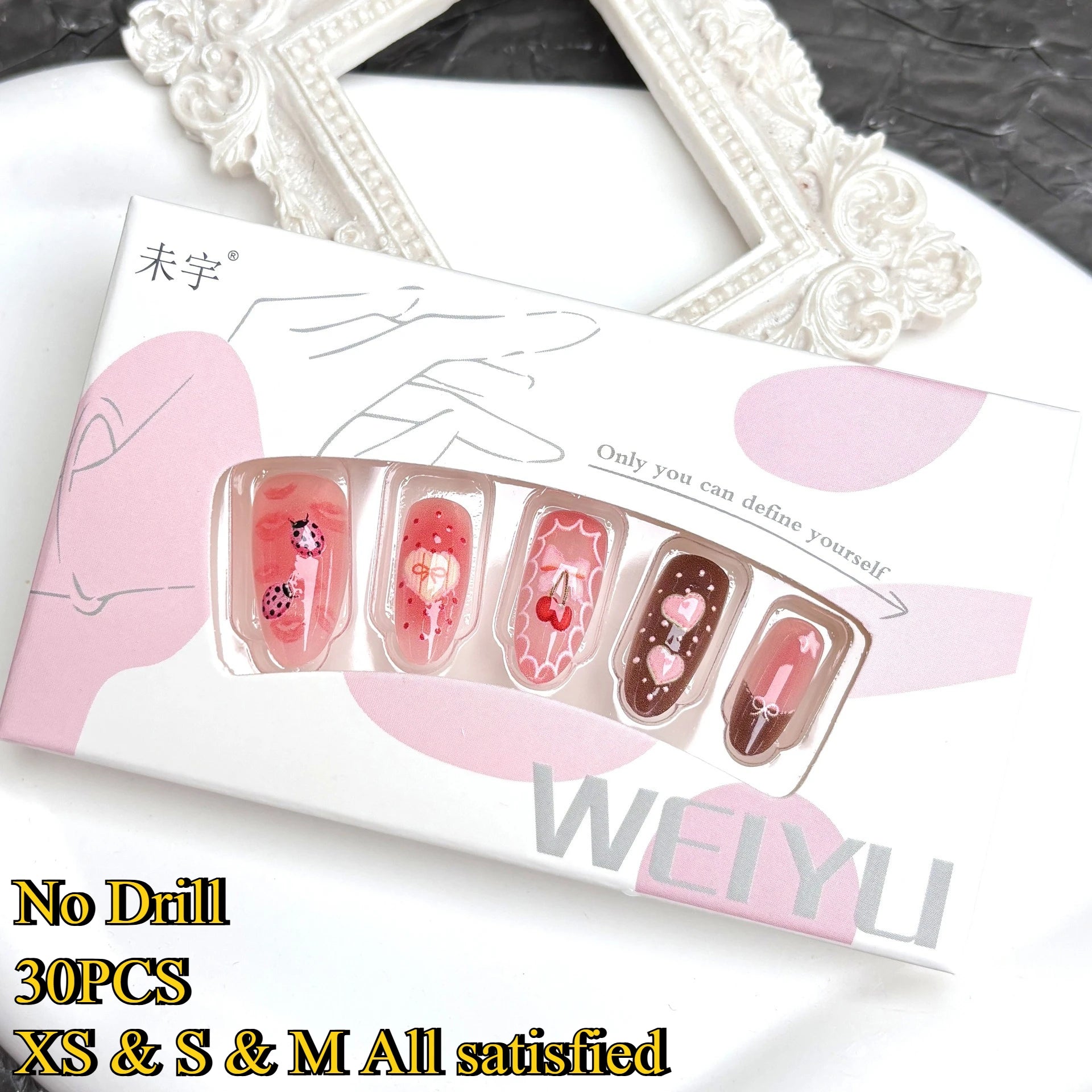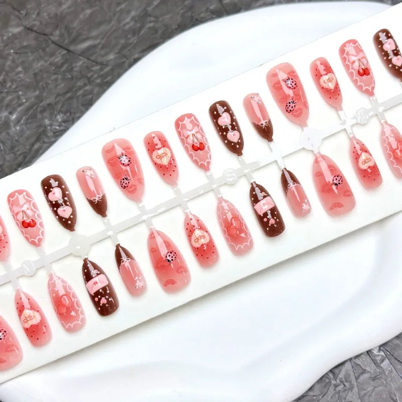 30 Cute Cherry Bowknots Ladybug Strawberry Decor False Nails