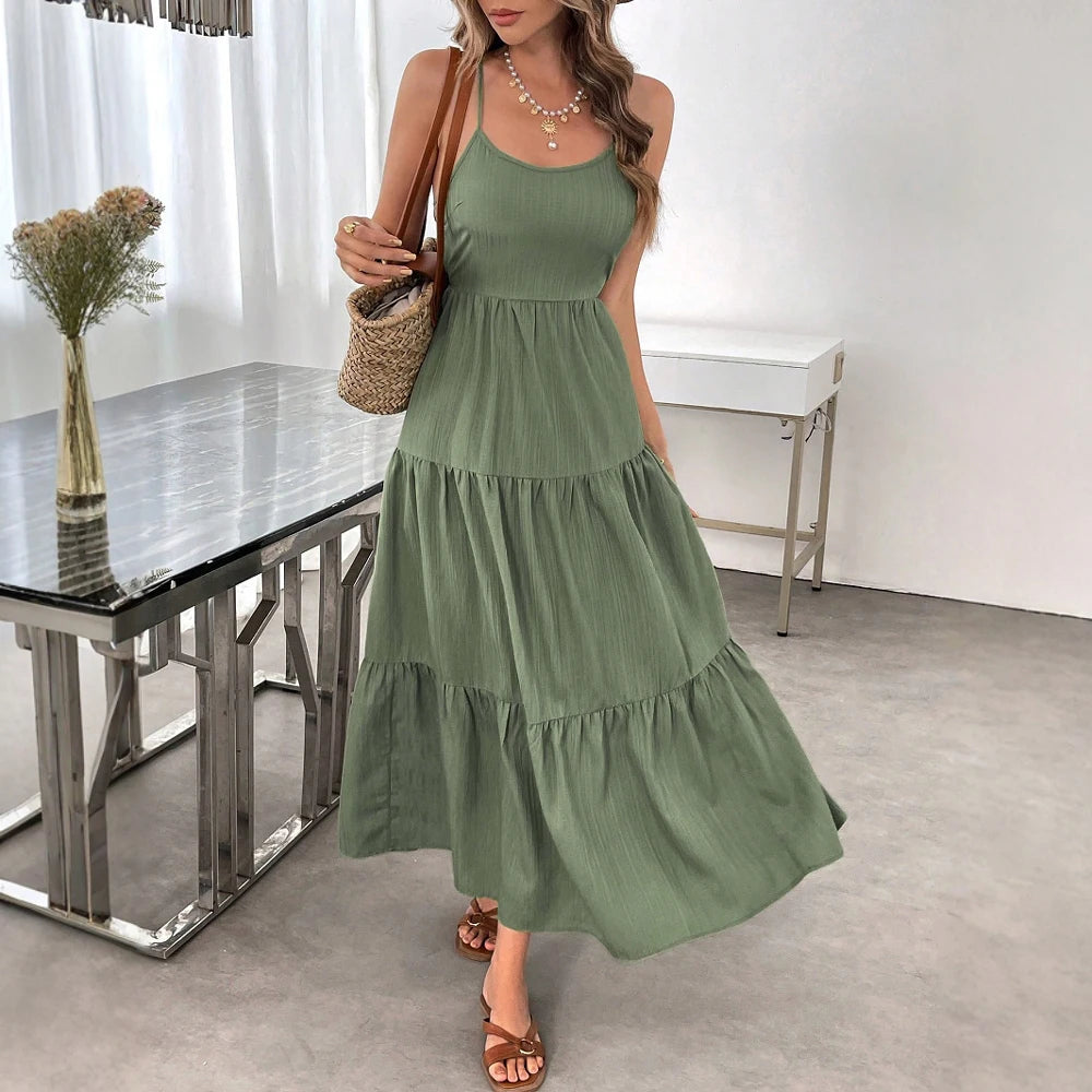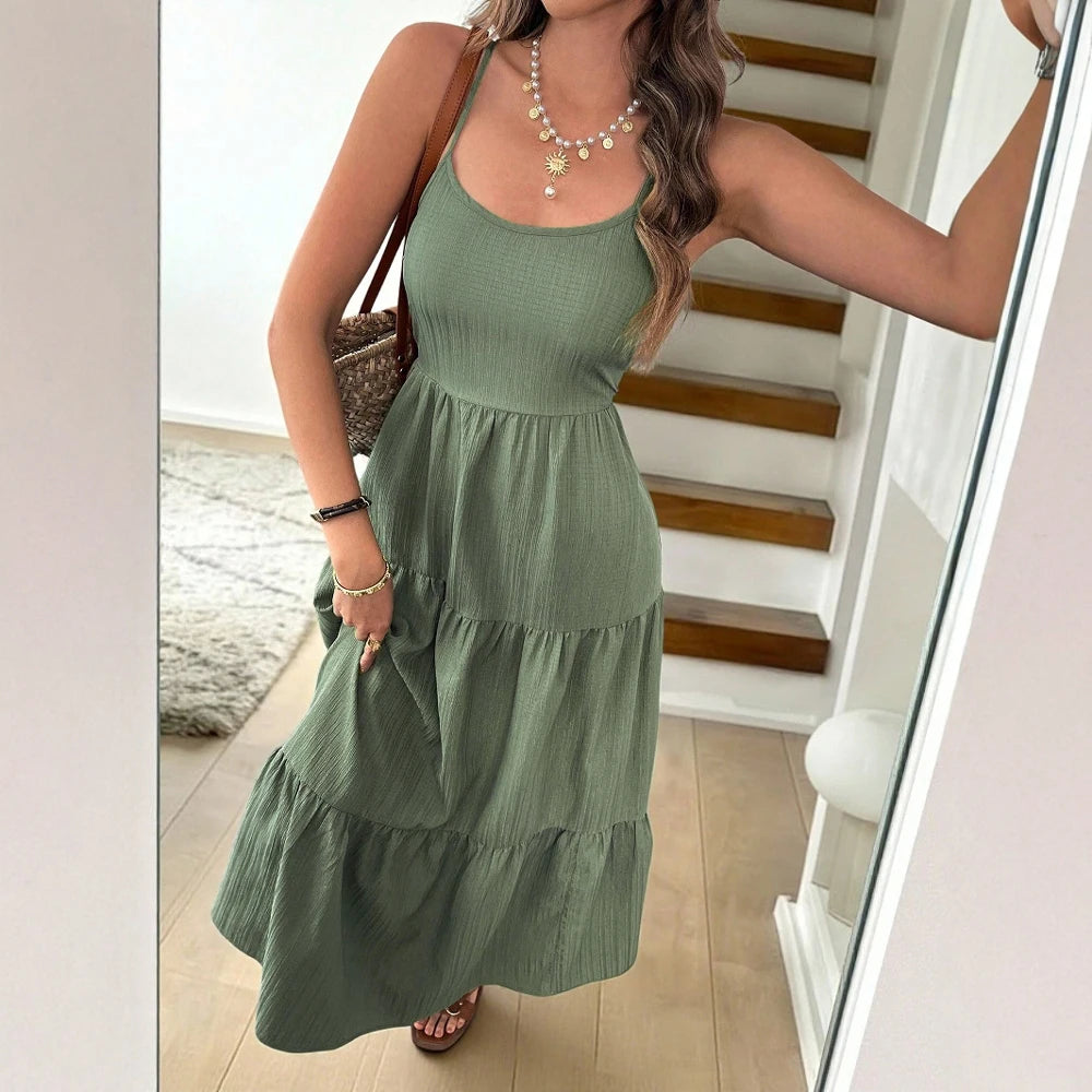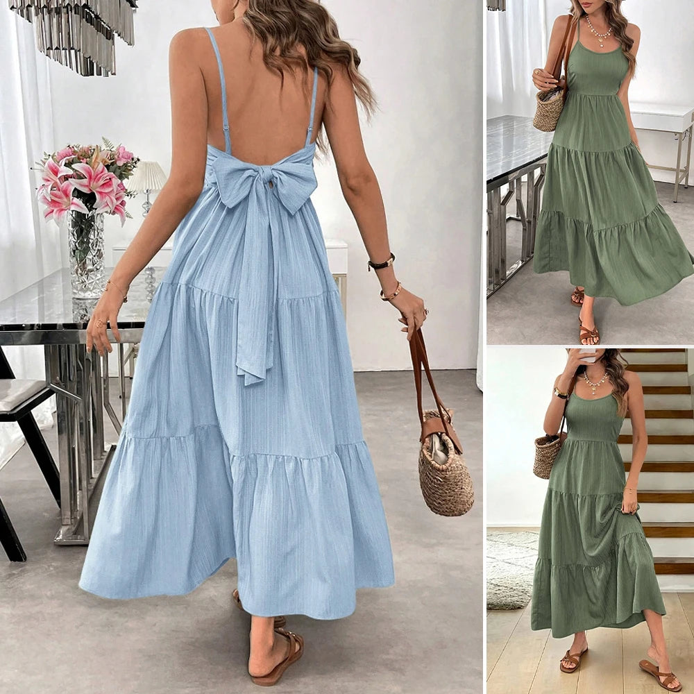 Street Wear Outfits | Women's Beach Plain Bowknot Backless Spaghetti Strap Scoop Neck Layered Midi Dresses