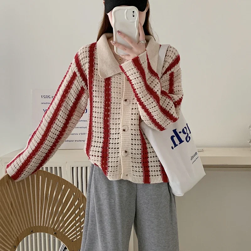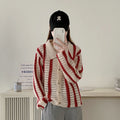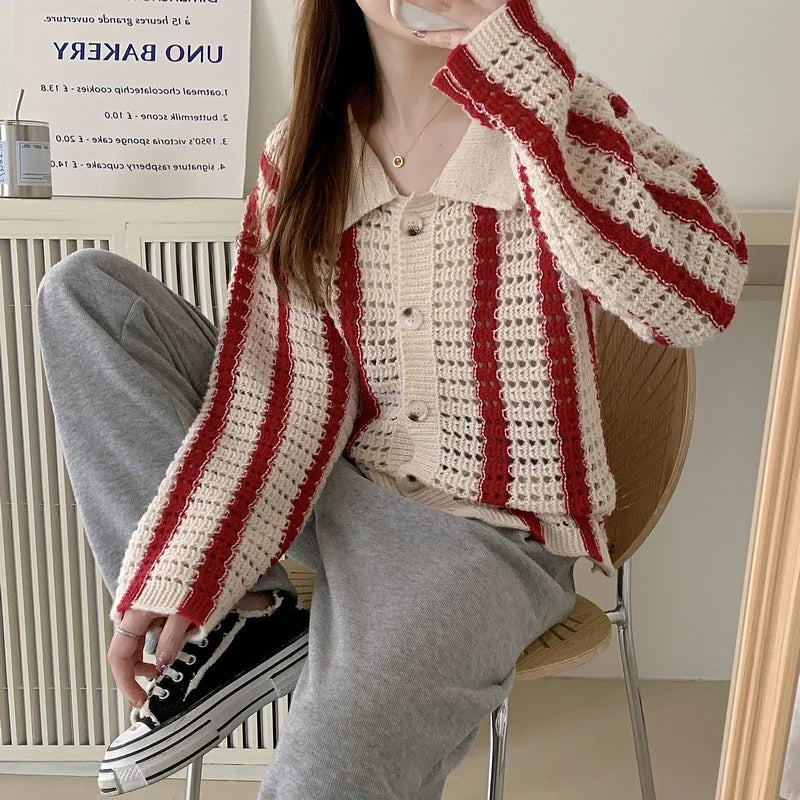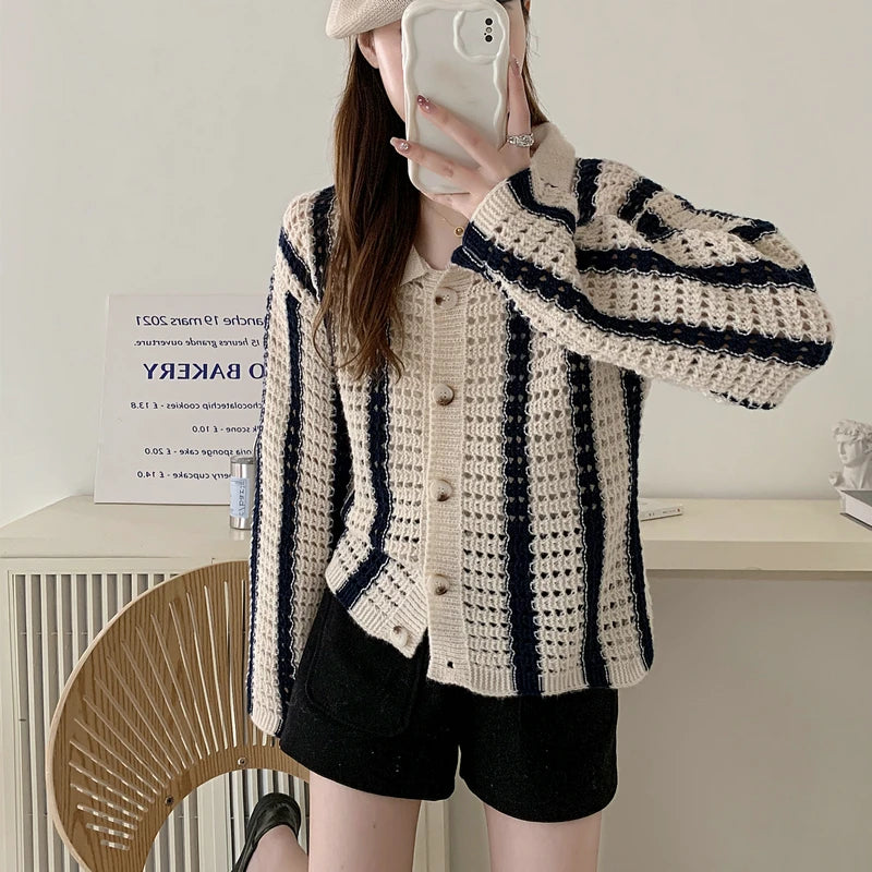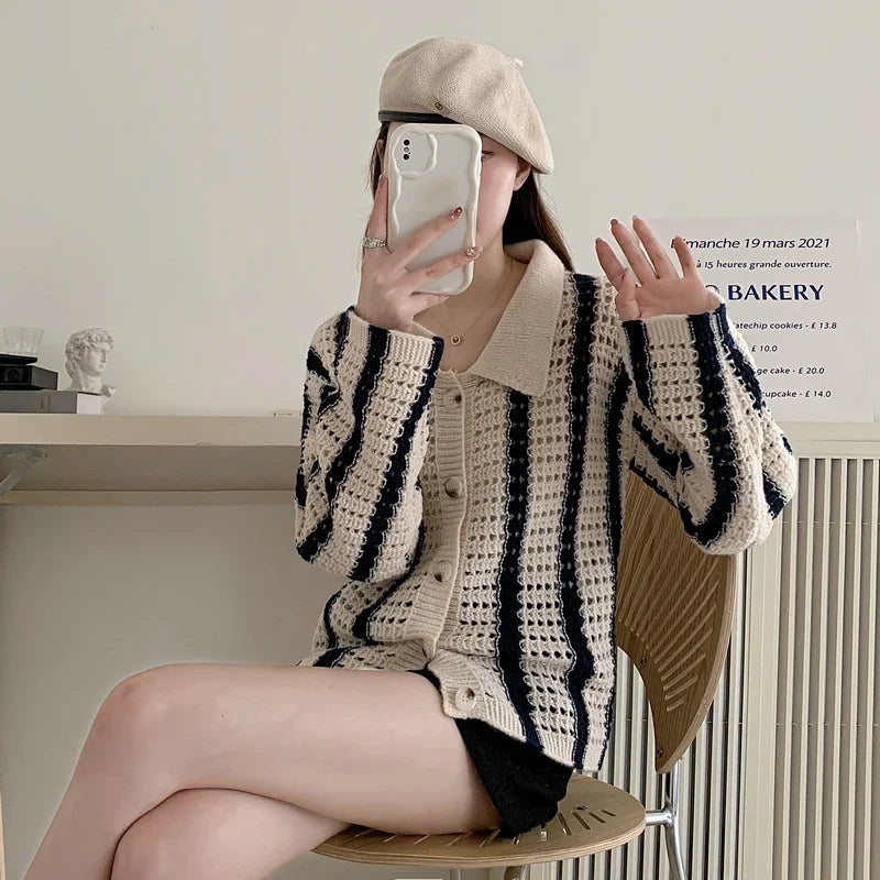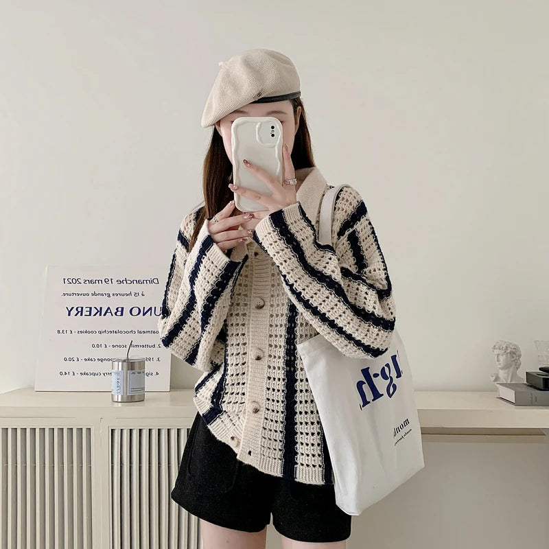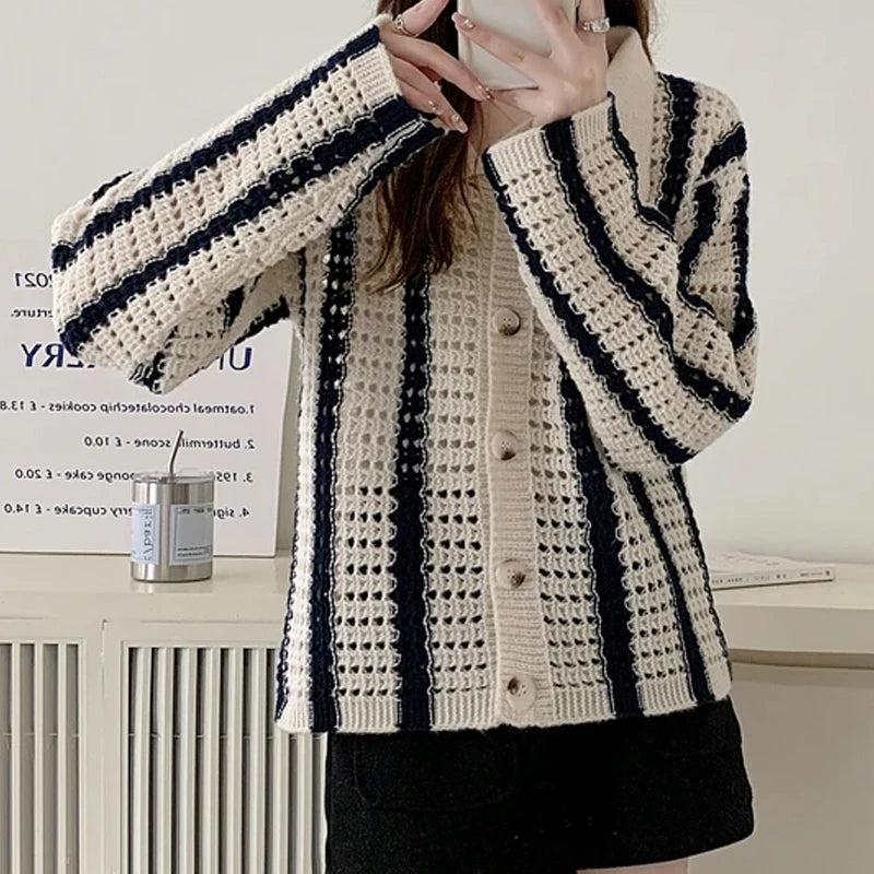 Fashion Lapel Striped Cardigan Sweater | Women Long Sleeve Knitted Coats