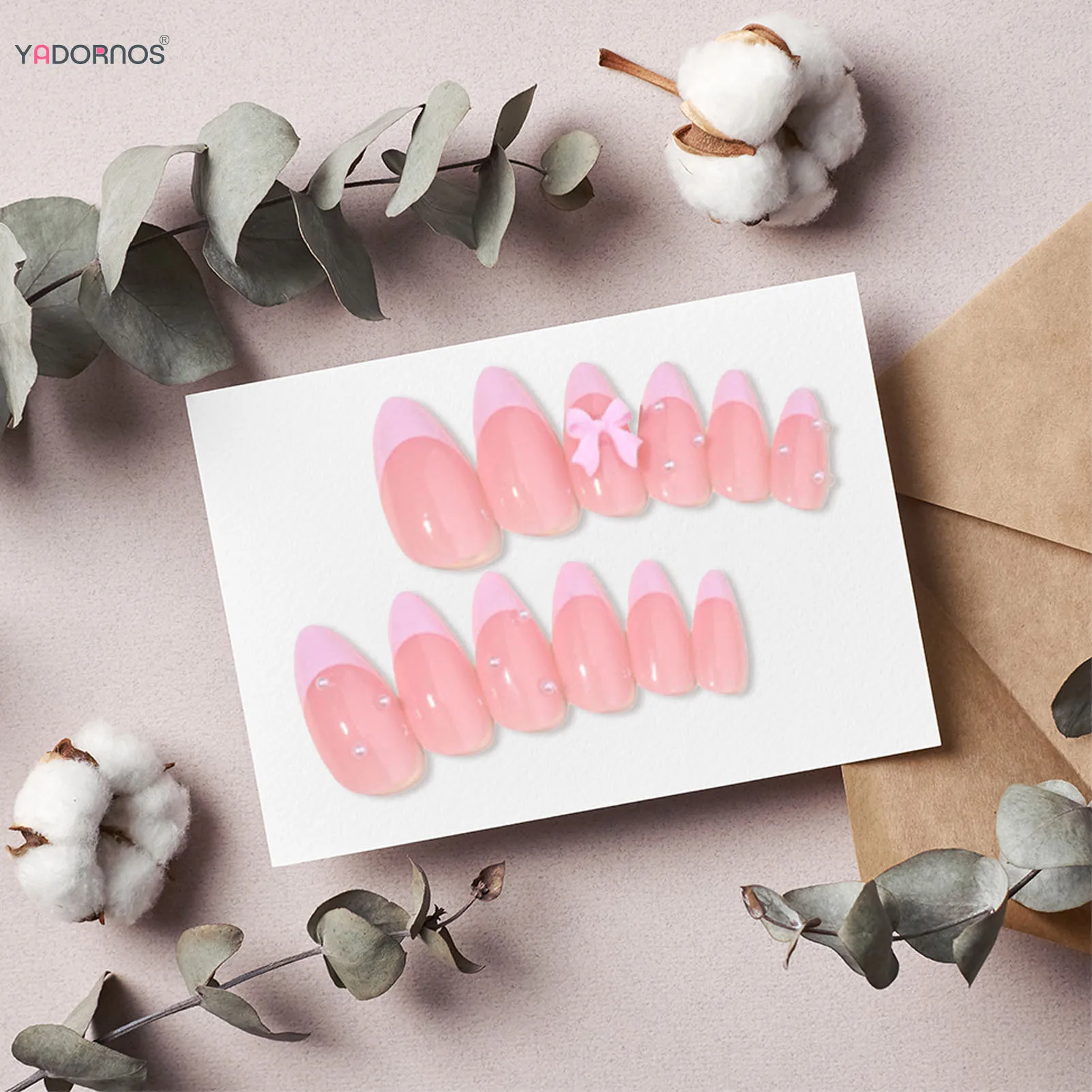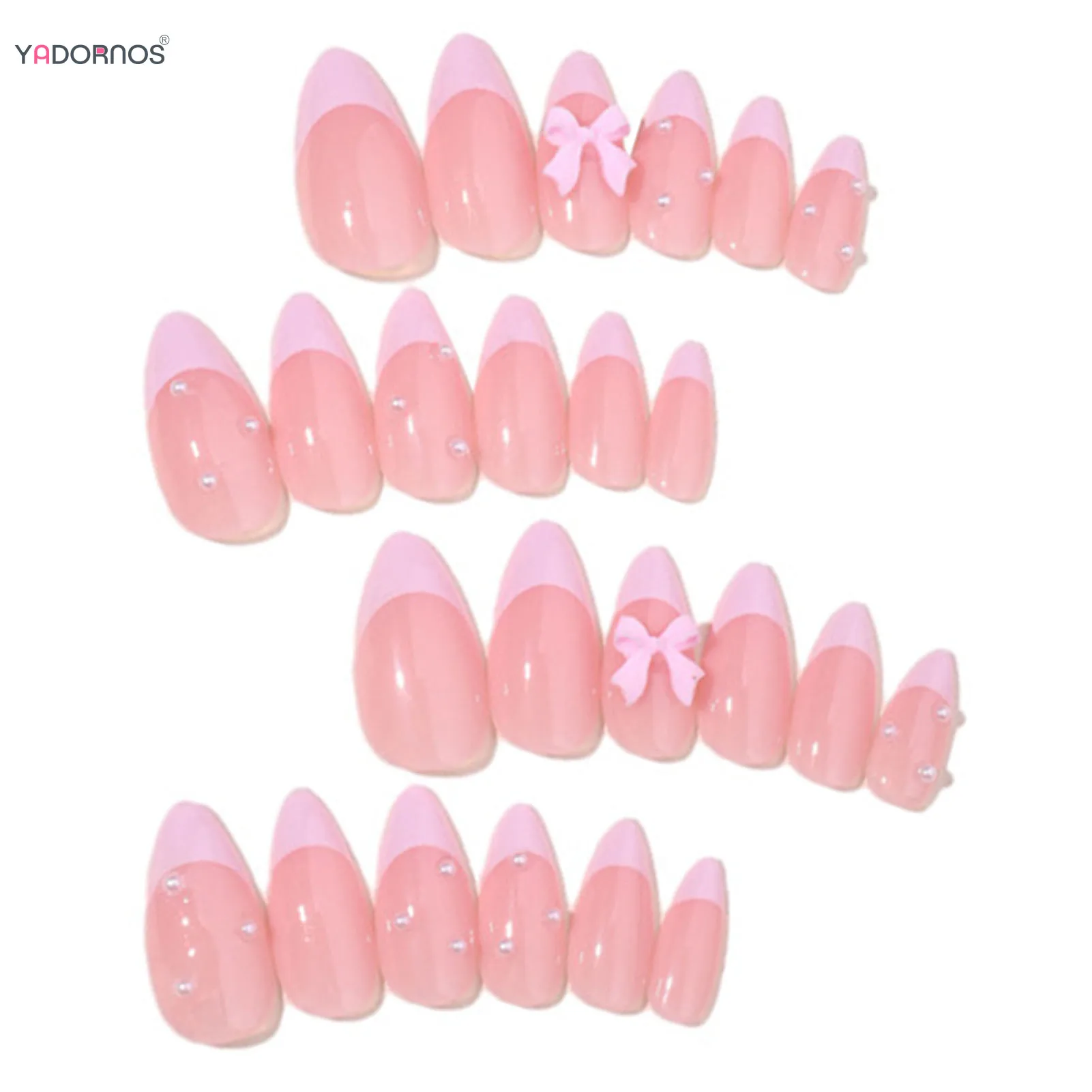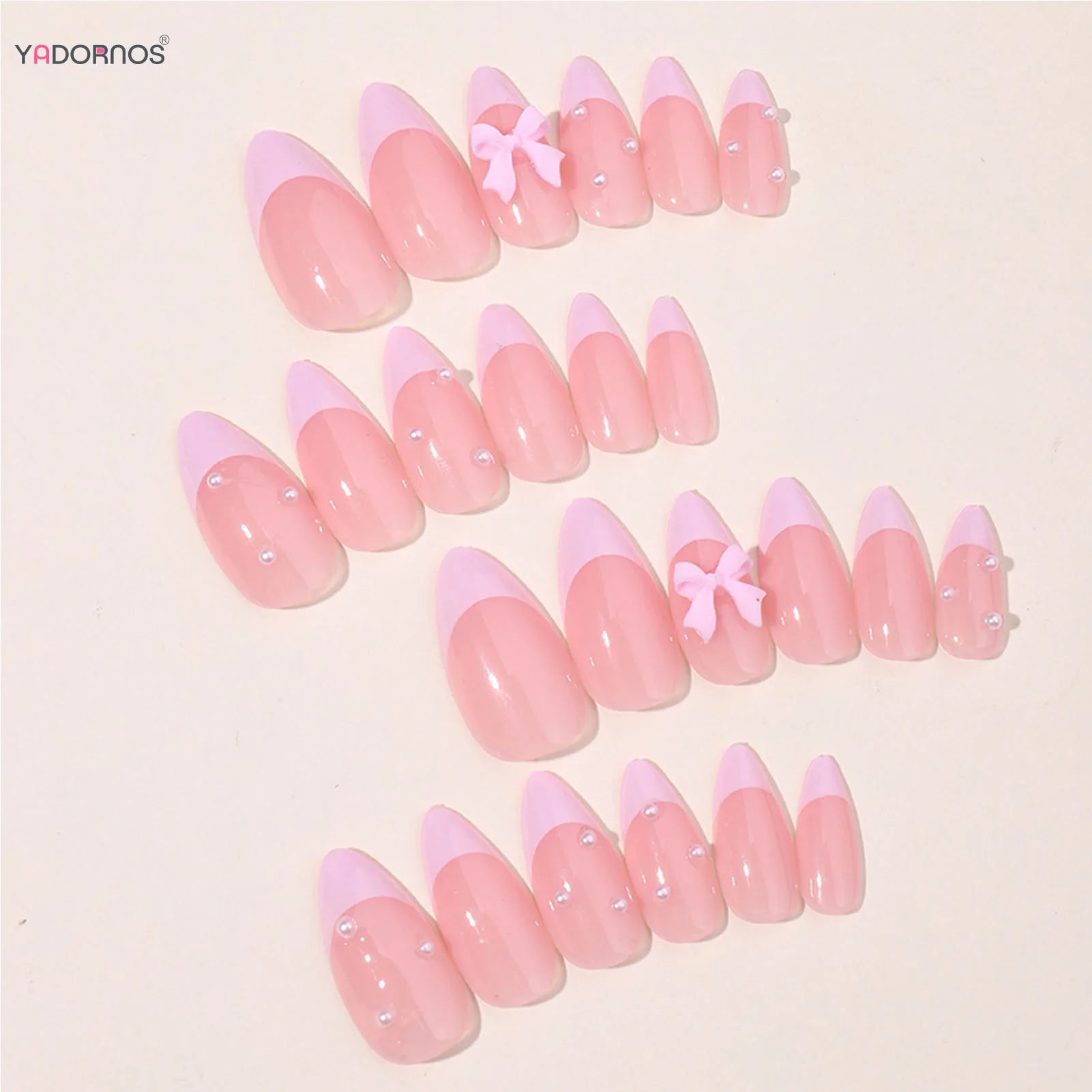 Almond Fake Nails Korean Style Bowknot Pearls Designs