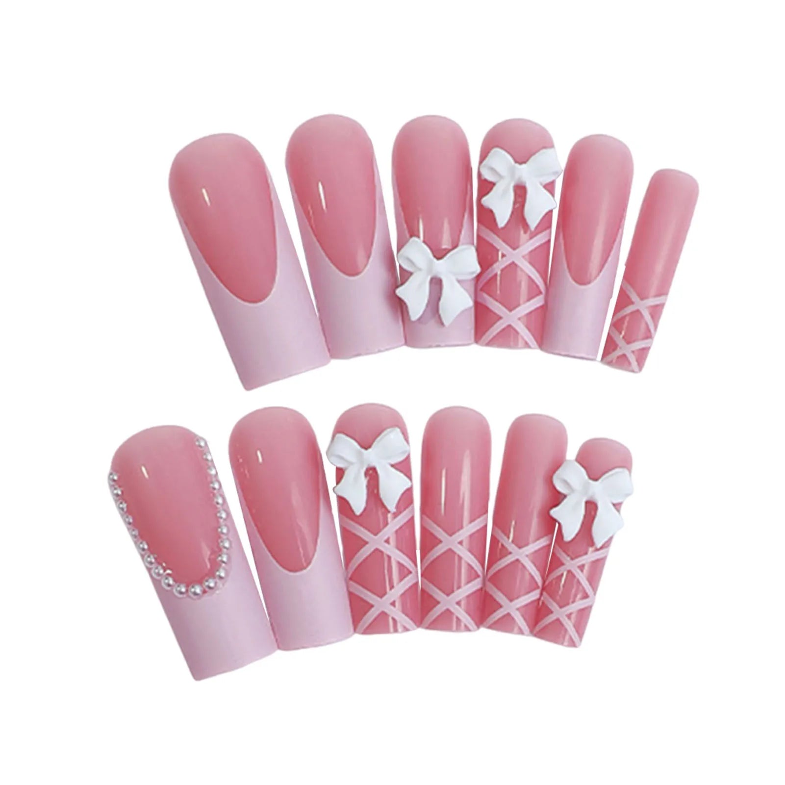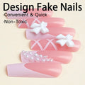 Trendy Design: Featuring a stylish nail art long coffin fake nail design with french tips white bow pink reusable artificial nail, these nails are perfect for creating a chic and fashionable manicure.
