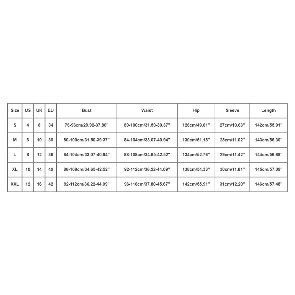 Size:XXL | US:12 | UK:16 | EU:42 | Bust/elastic:92-112cm/36.22-44.09'' | Waist:96-116cm/37.80-45.67'' | Hip:142cm/55.91'' | Sleeve:31cm/12.20'' | Length:146cm/57.48'' |