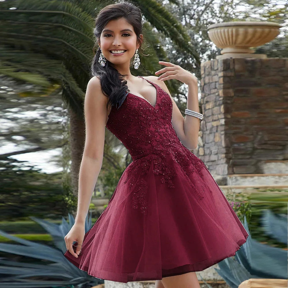 Beading V Neck Cocktail Dresses | Spaghetti Straps Lace Appliqued Pearls Homecoming Dress | Graduation Gown