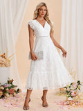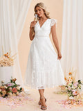 Embroidered V-Neck Short Sleeve A-line Tulle Midi Dress