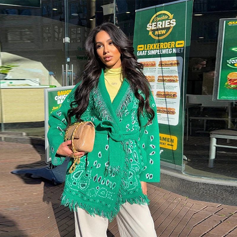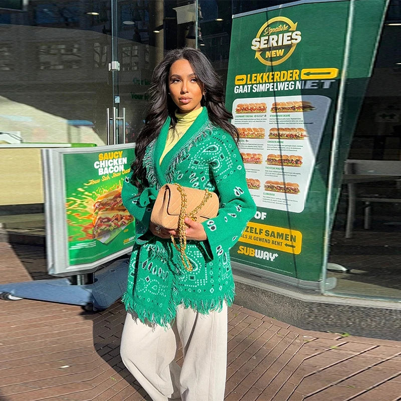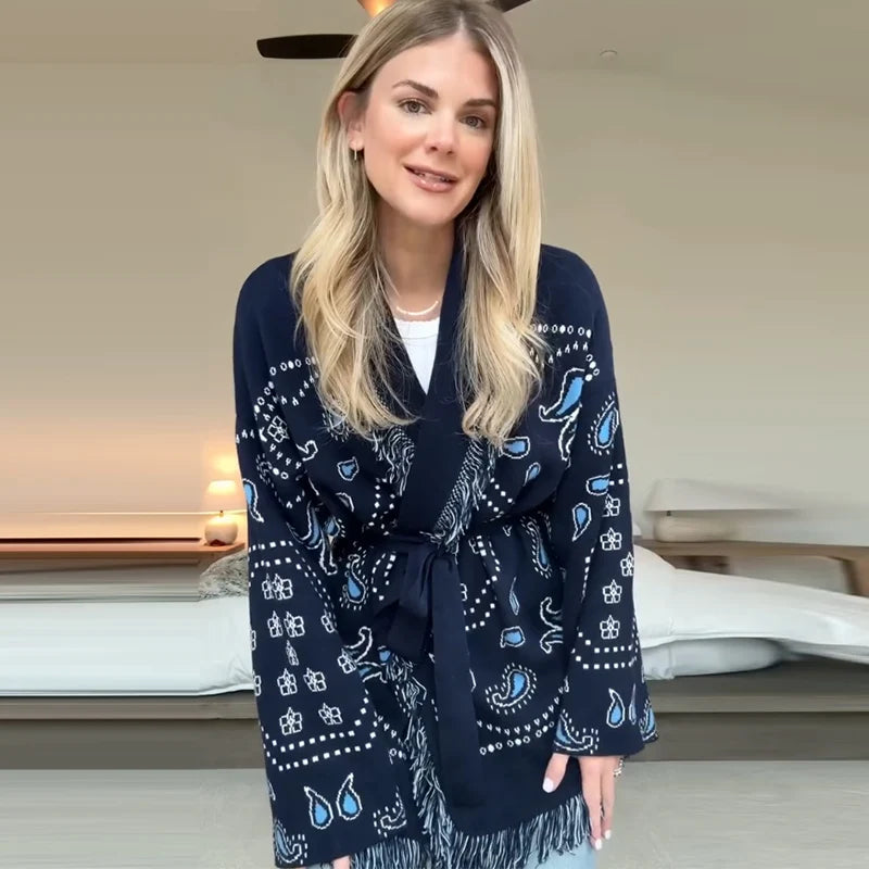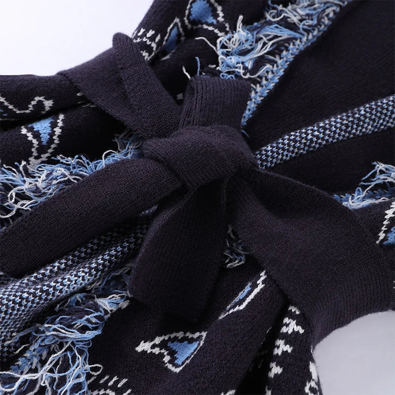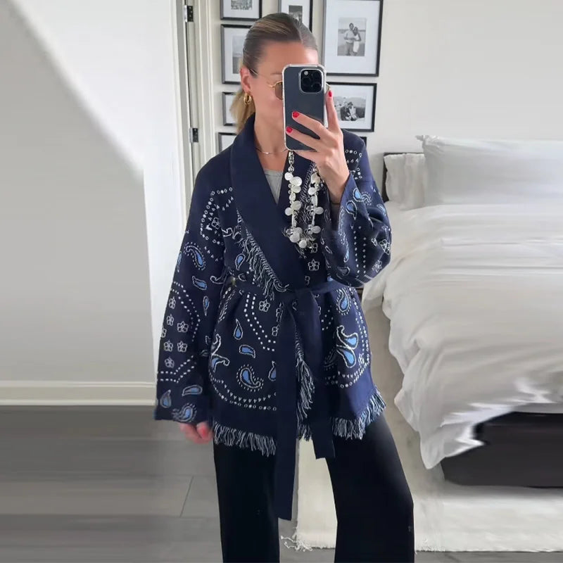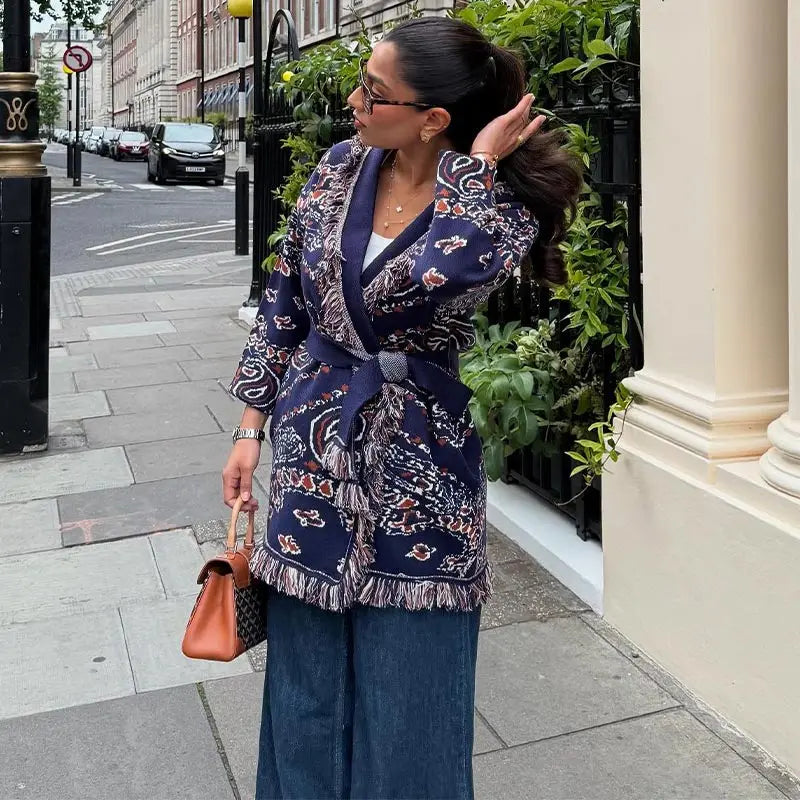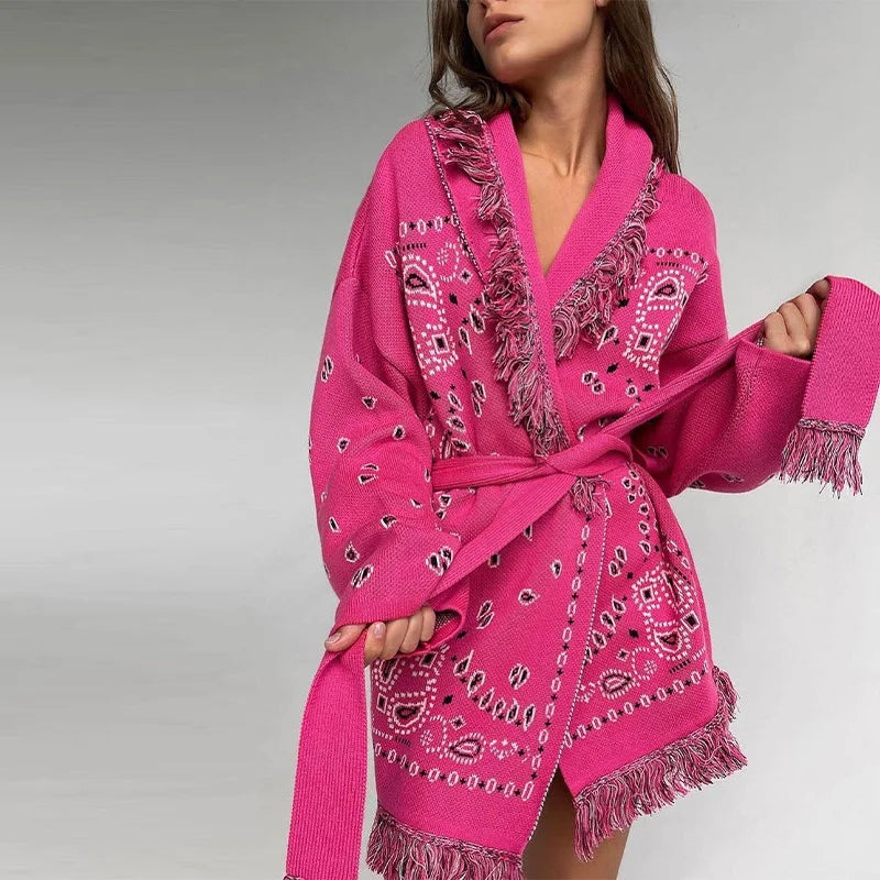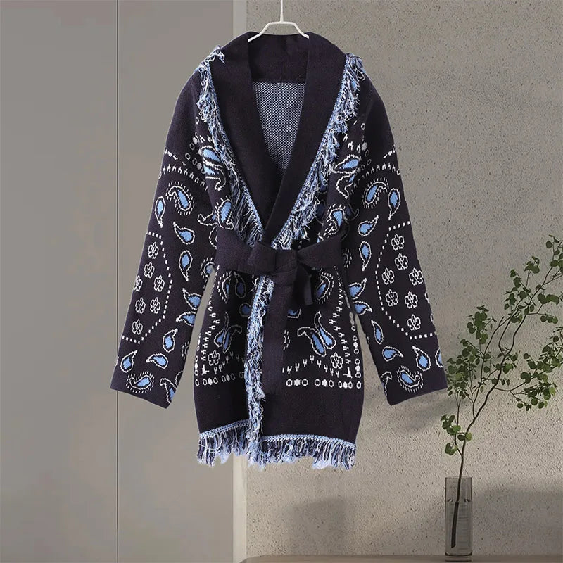 Vintage Print Tassels Knit Cardigan | Women V Neck Long Sleeves Belts Sweater Coats