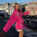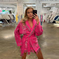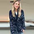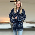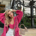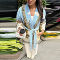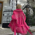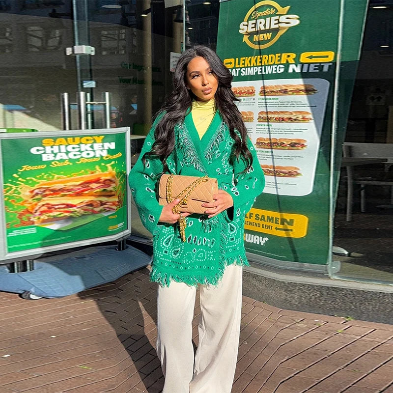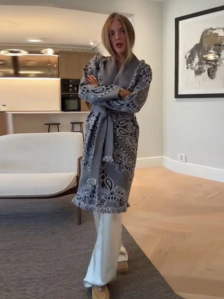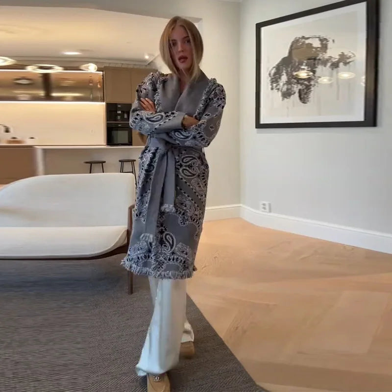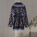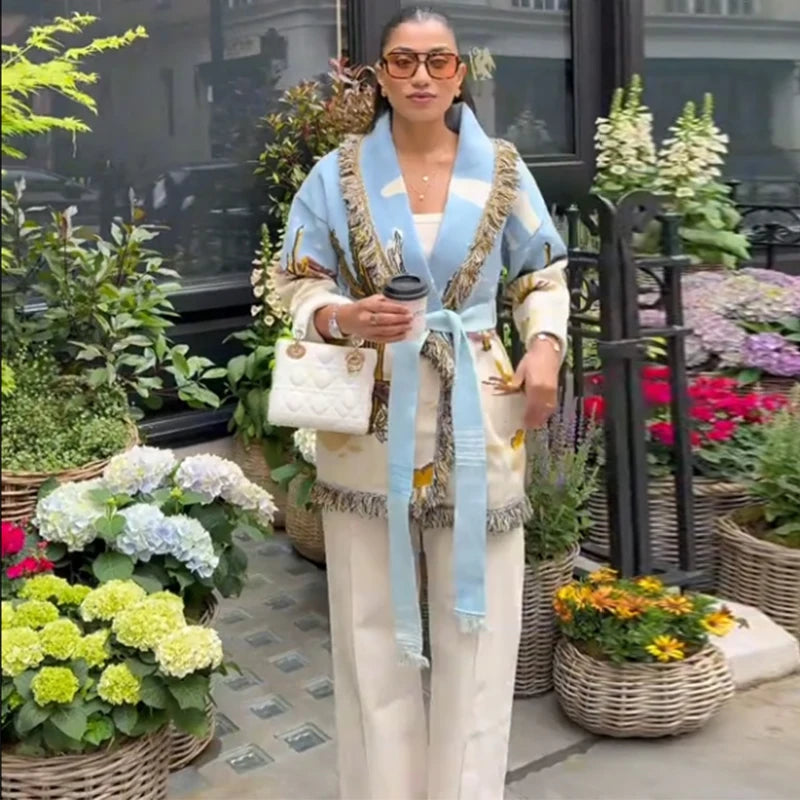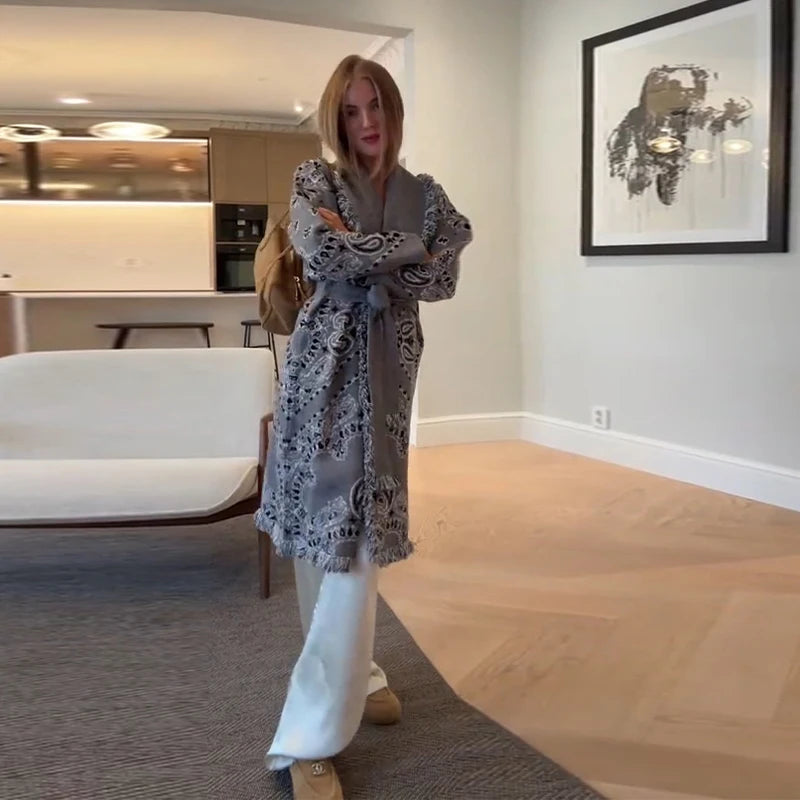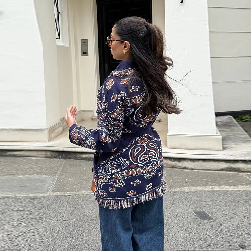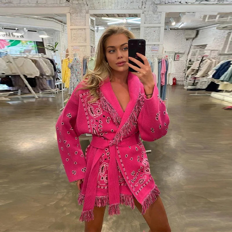 Vintage Print Tassels Knit Cardigan | Women V Neck Long Sleeves Belts Sweater Coats