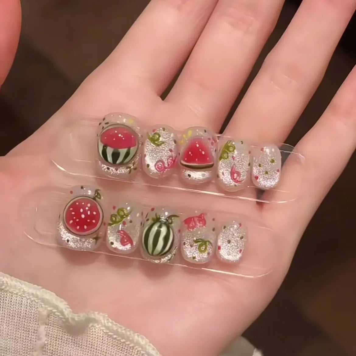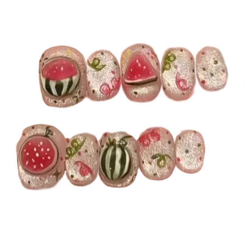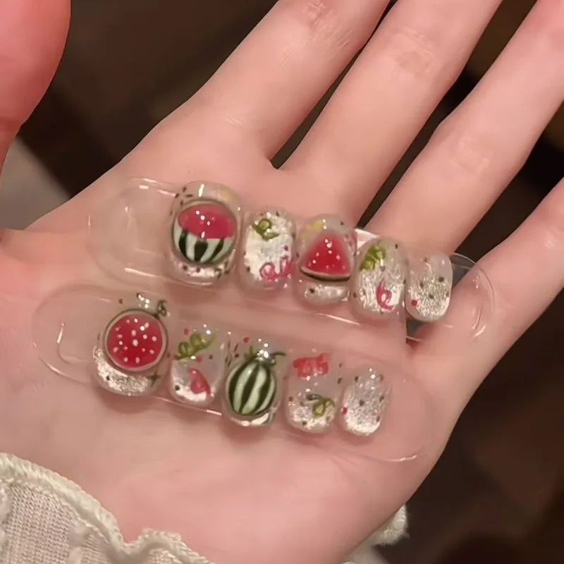 10 Pieces Summer Cold Watermelon Press On Nails | Cute Fresh Translucent Short False Nails