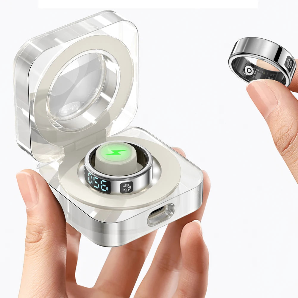 Feature: 1. Versatile Smart Ring: This smart ring supports multiple sports modes and provides real-time heart rate monitoring. Simply tap to display your last reading and initiate new tests, making it an essential companion for fitness enthusiasts. 2. Comprehensive Health Monitor: With advanced features like sleep tracking and blood oxygen measurement, this health monitor offers detailed insights into your well-being. Tap to view sleep duration and blood oxygen levels, ensuring you stay informed about your health. 3. Innovative Health Fitness Rings: These health fitness rings seamlessly integrate for WeChat and Apple Health, allowing you to track your steps and sync with your favorite health apps. Enjoy multilingual app support for a personalized fitness journey. 4. Dynamic Sport Health Ring: Experience the future of interaction with this sport health ring, which enables gesture controls for TikTok and other apps. Effortlessly browse videos, scroll pages, and shop online without touching your phone screen. 5. Convenient Sleep Ring: Capture perfect moments with the sleep ring's remote photo-taking feature. A simple gesture triggers the camera, allowing you to take stunning selfies and photos with ease, elevating your photography experience. Specification: Origin: Mainland China Size:Size: 8 (inner diameter 18.2mm), 9 (inner diameter 19.0mm), 10 (inner diameter 19.9mm), 11 (inner diameter 20.7mm), 12 (inner diameter 21.5mm) Thickness: 2.5mm Weight: about 3.4g Waterproof: 5ATM waterproof, can be worn for diving or snorkeling, supports waterproof depth of more than 50 meters" Material: stainless steel + glue filling process Main chip model: German Dialog DA14585) - ultra-low power consumption Body storage capacity (ROM+RAM): 128kb ROM + 96 Kb RAM Sensor: SC7A20 Bluetooth-Compatible version: 5.1 Support APP-side GPS data: Yes Heart rate sensor model: Tianyi 3918 Battery type: polymer pure cobalt battery Working temperature: 0-50℃ Battery capacity: 18mah Charging time: 2 hours Theoretical standby time: 16 days-20 days Usage time: 3 days-4 days Compatibility: Support Android 9.0 and above; Apple IOS 10.0 and above Compatible software: Jring Support OTA (OTA upgrade): Support Fota upgrade APP: Jring Packaging size: 83*82*28.5mm Gross weight: 65g Note: The charging case is not included! Note: ![]() 1 X Smart Ring