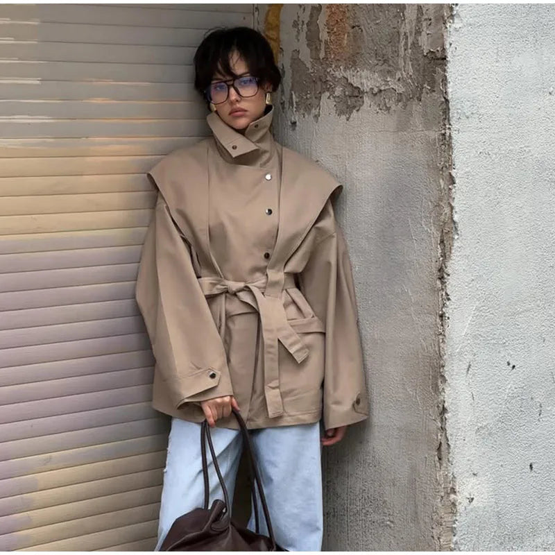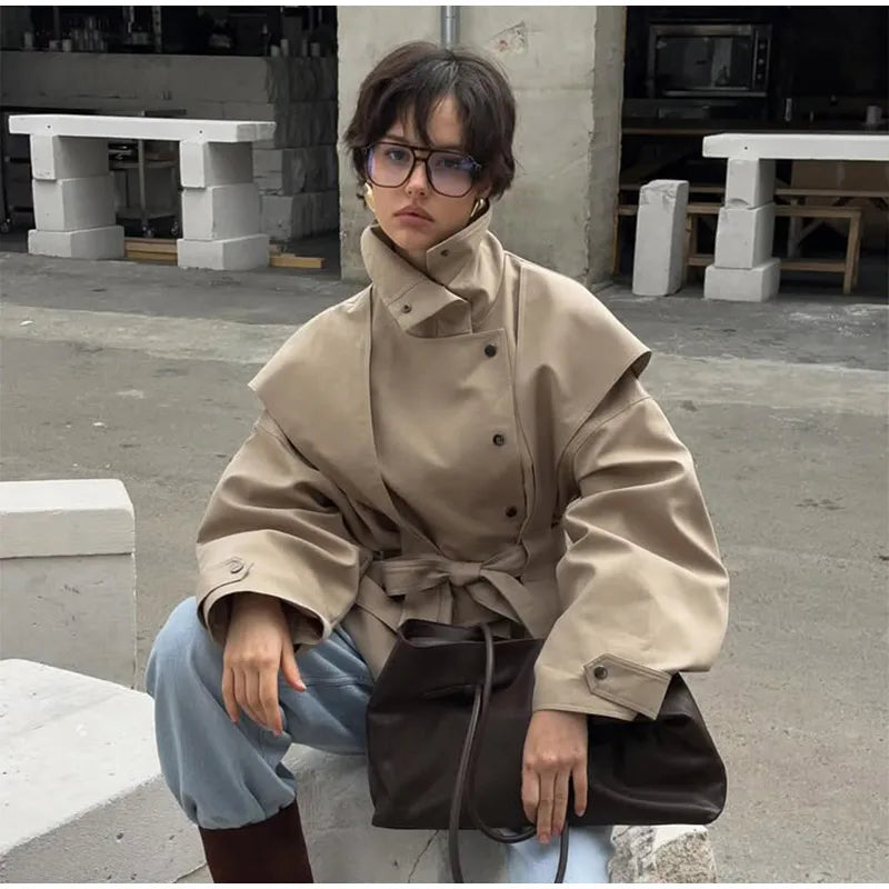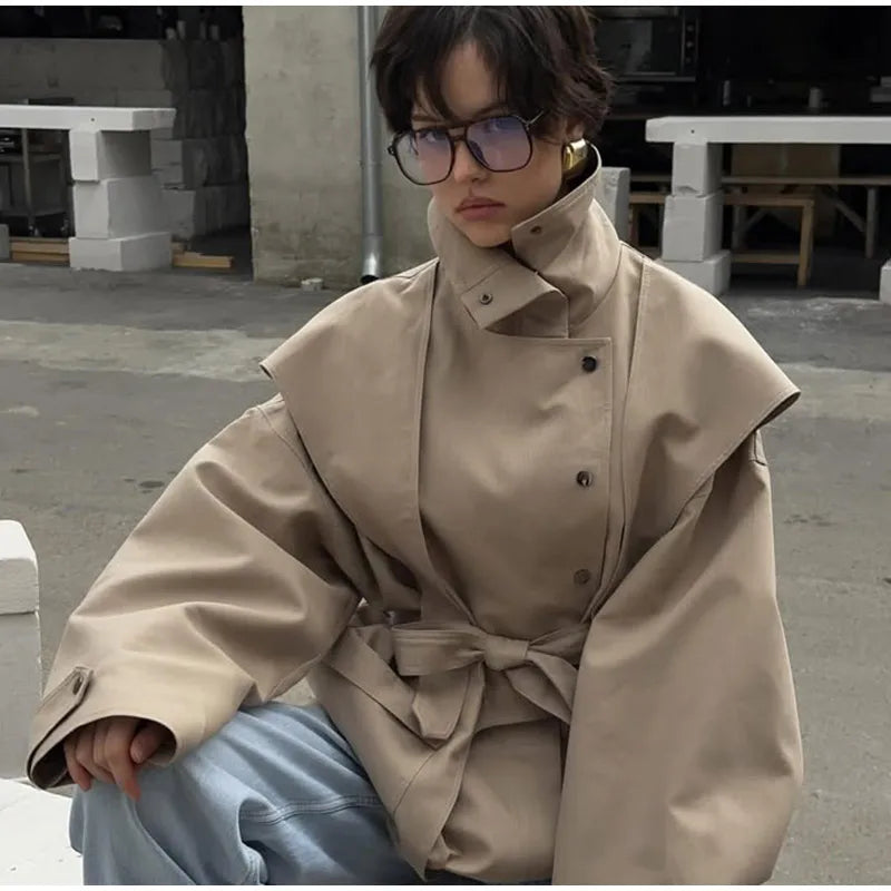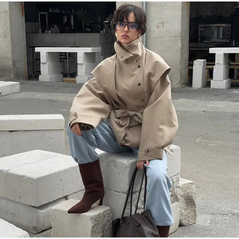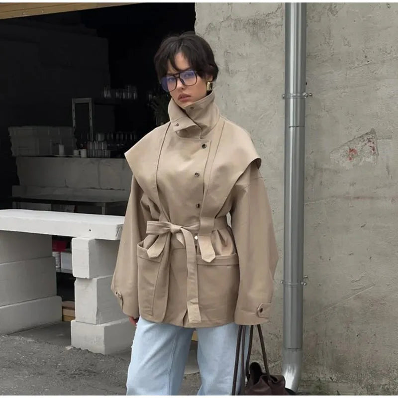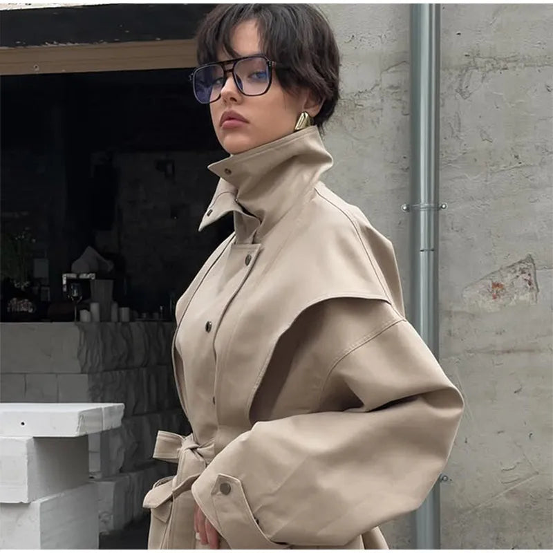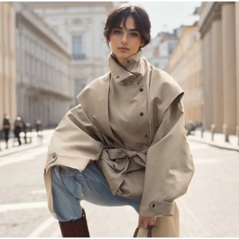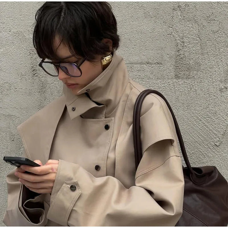 Featuring a high neck, turn-down collar, and double-breasted closure, it adapts to various styling preferences.
