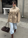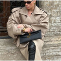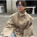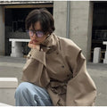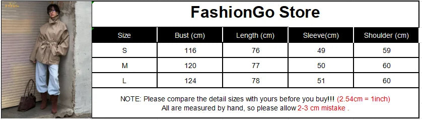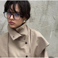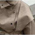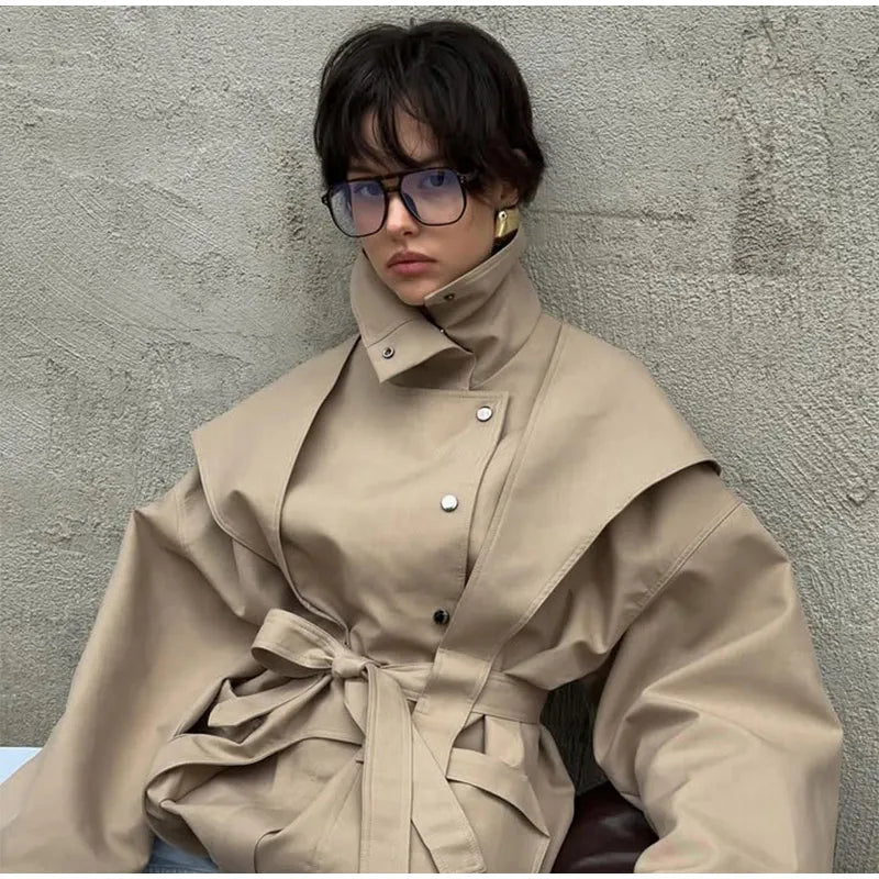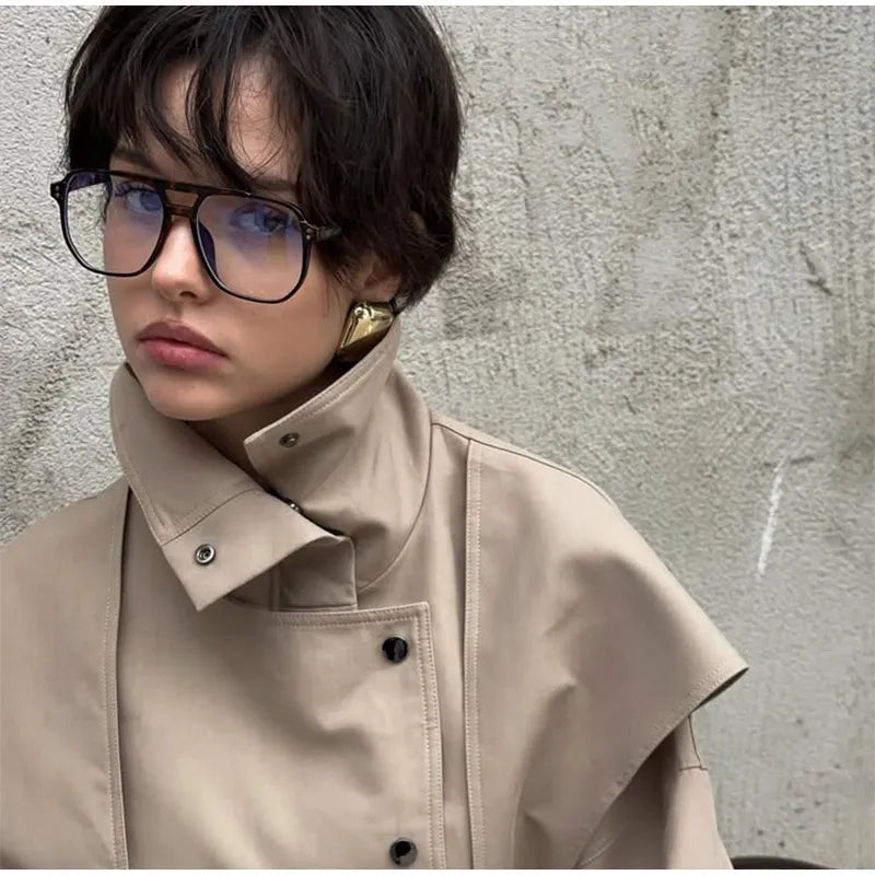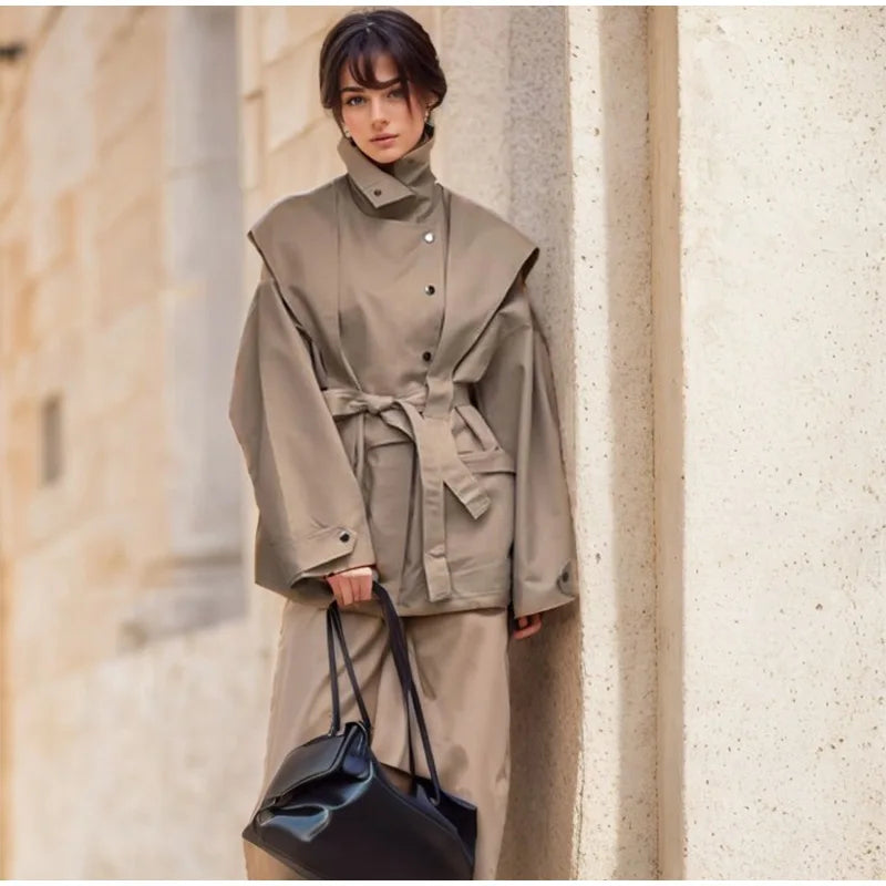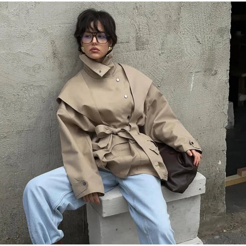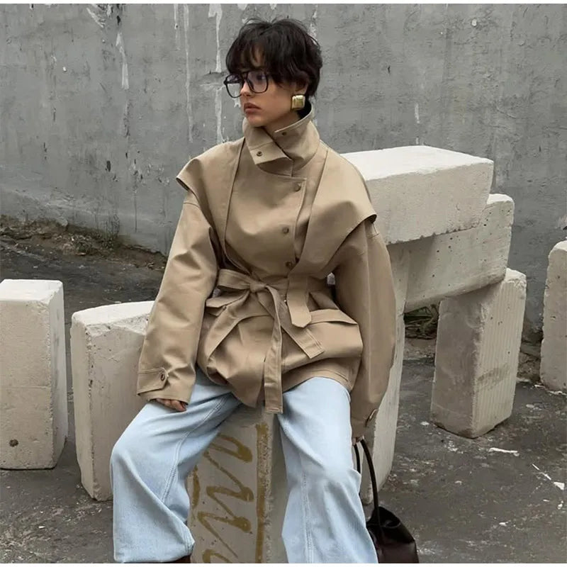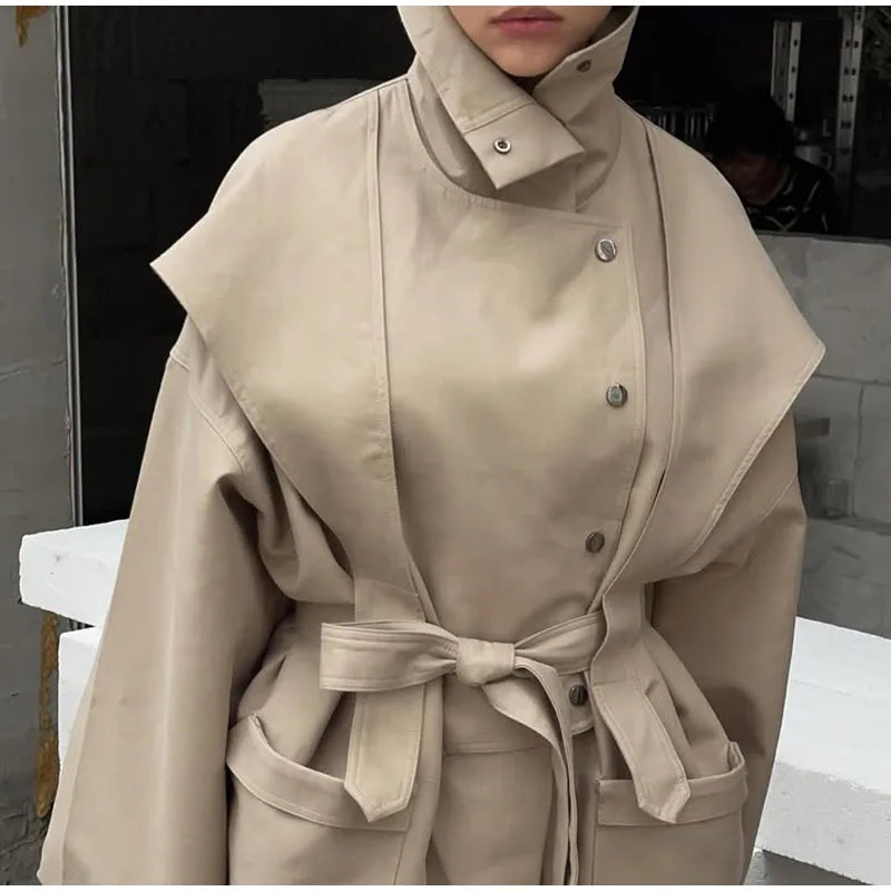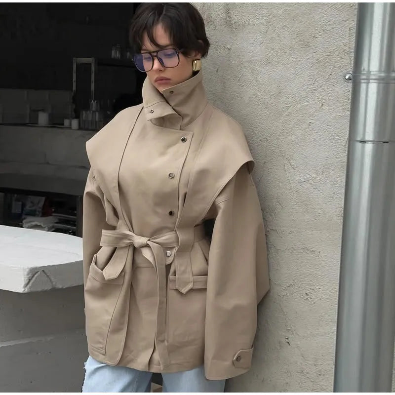 Featuring a high neck, turn-down collar, and double-breasted closure, it adapts to various styling preferences.