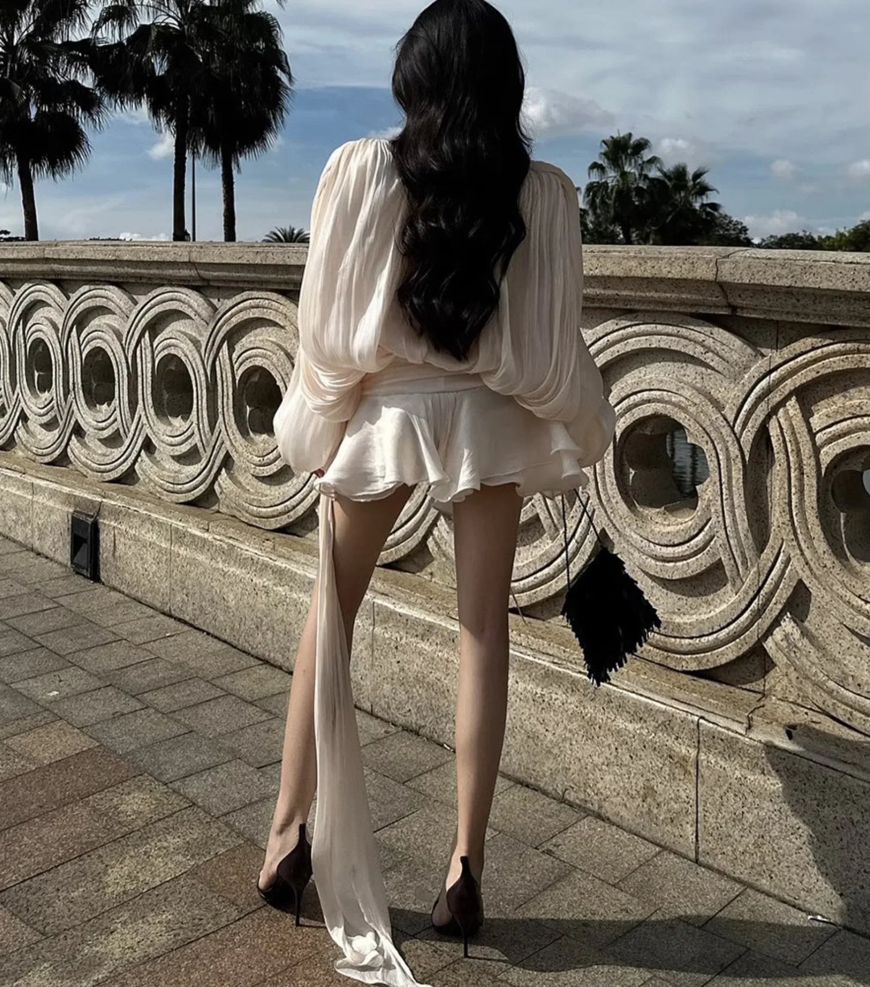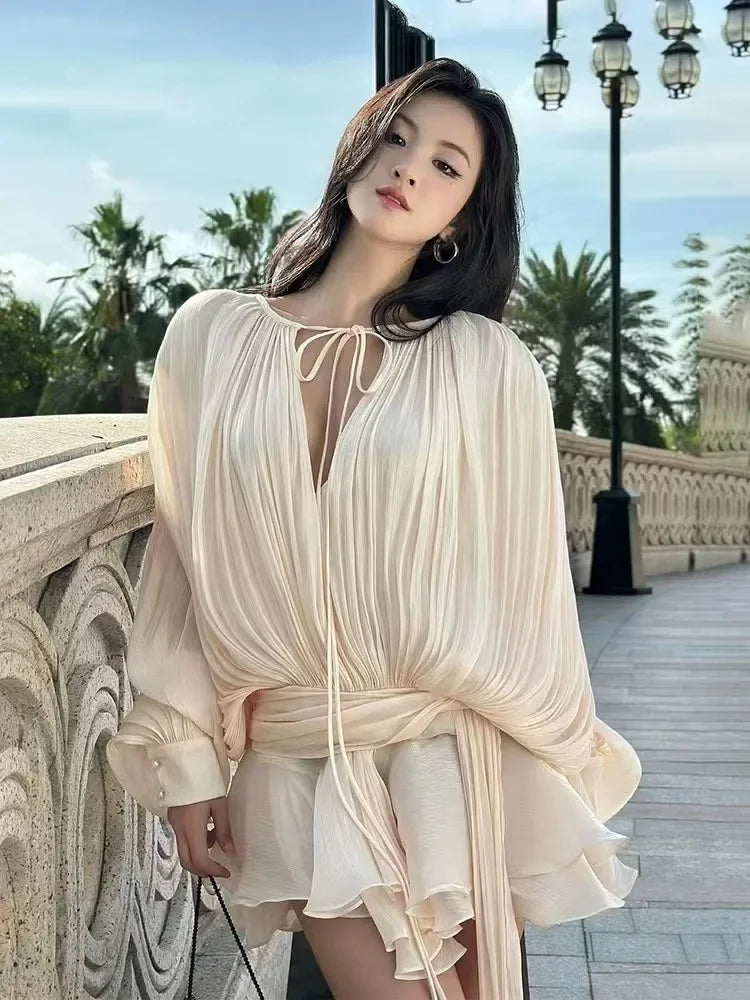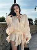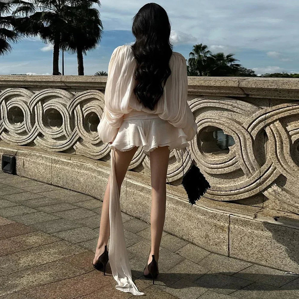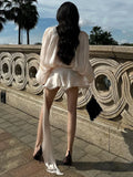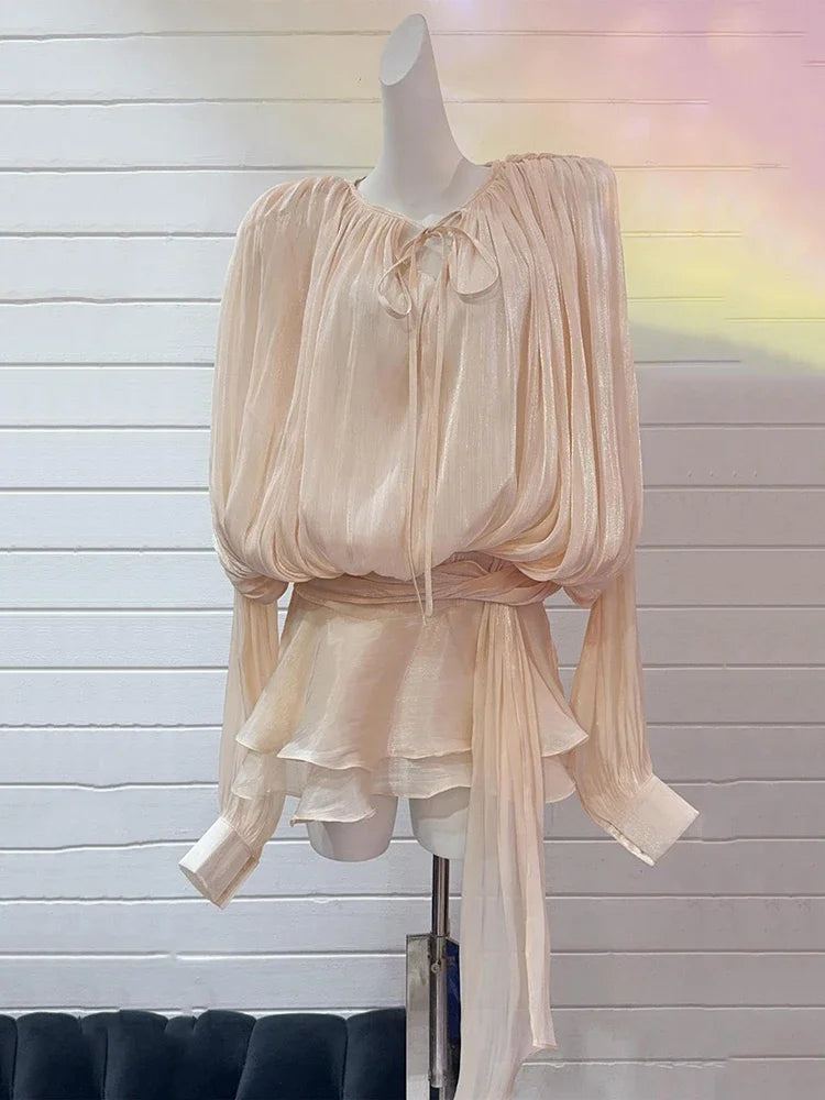 Suninheart Women 2 Piece Set Casual | Lace Up Long Slevees Loose Ruffles Shirt High Waist Bottom Short