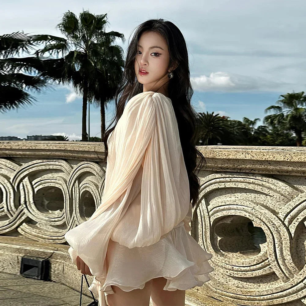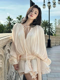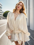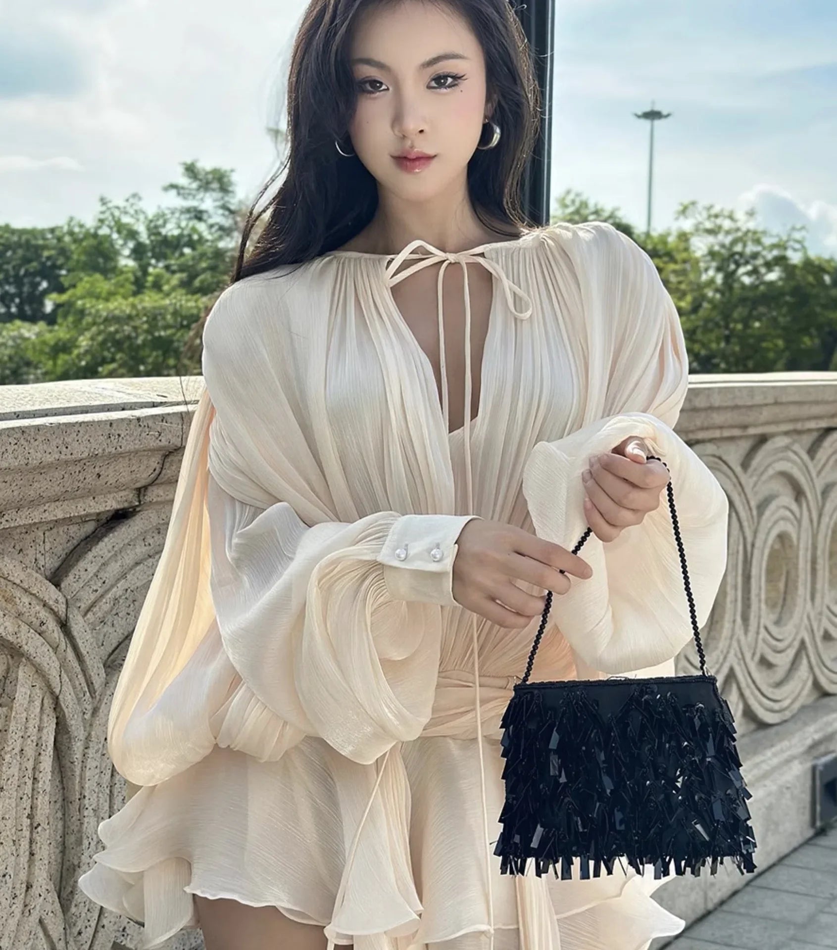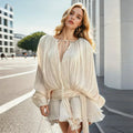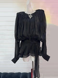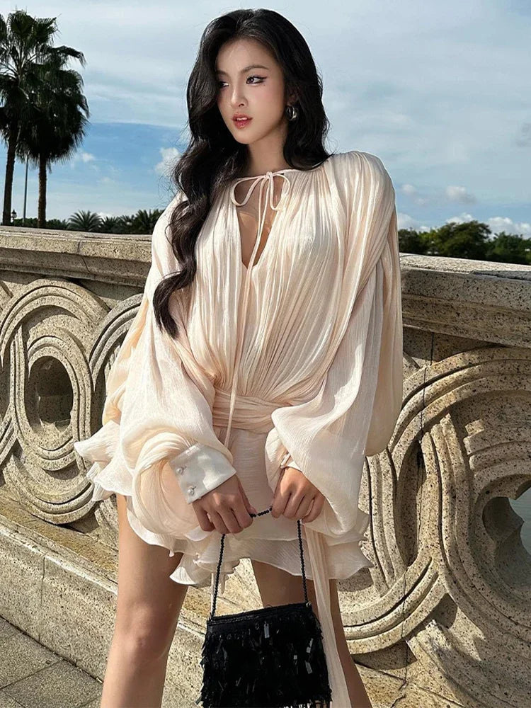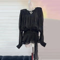 Suninheart Women 2 Piece Set Casual | Lace Up Long Slevees Loose Ruffles Shirt High Waist Bottom Short