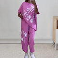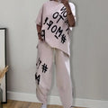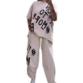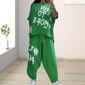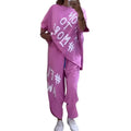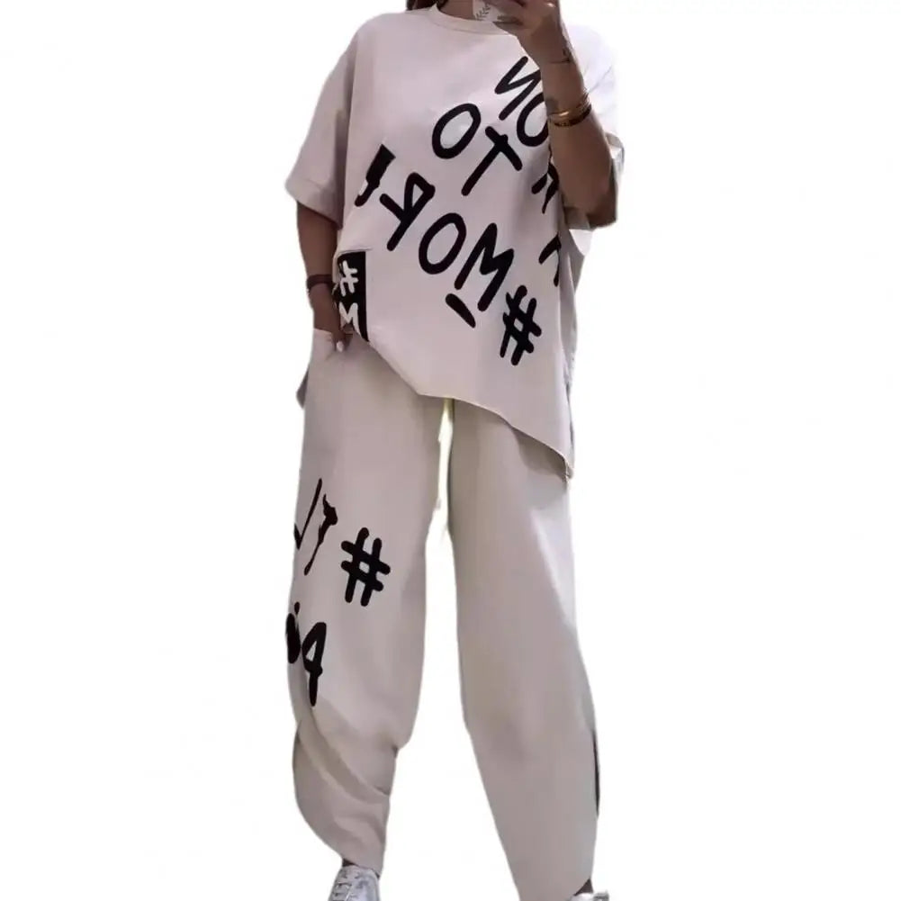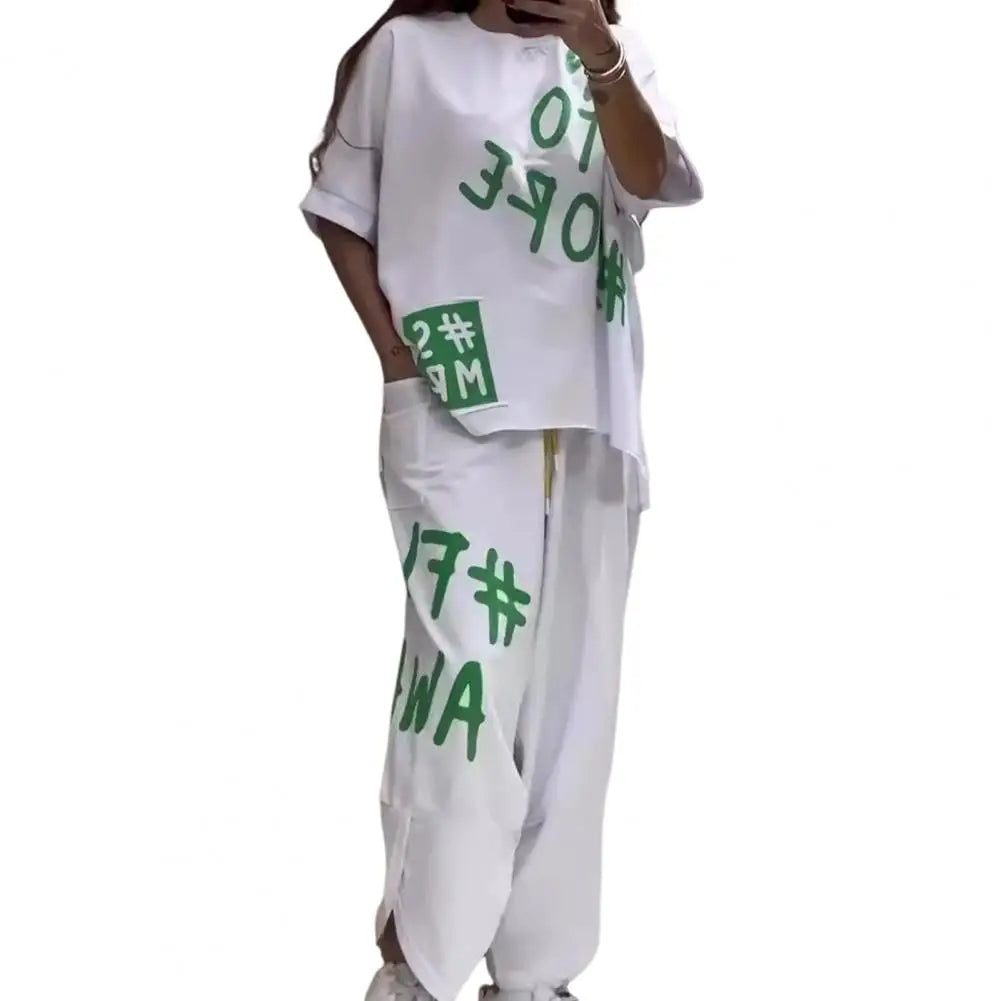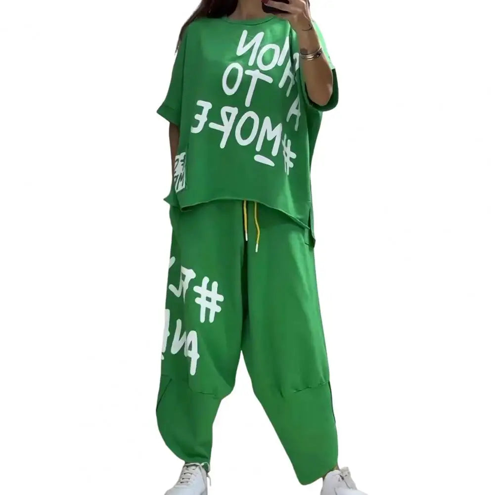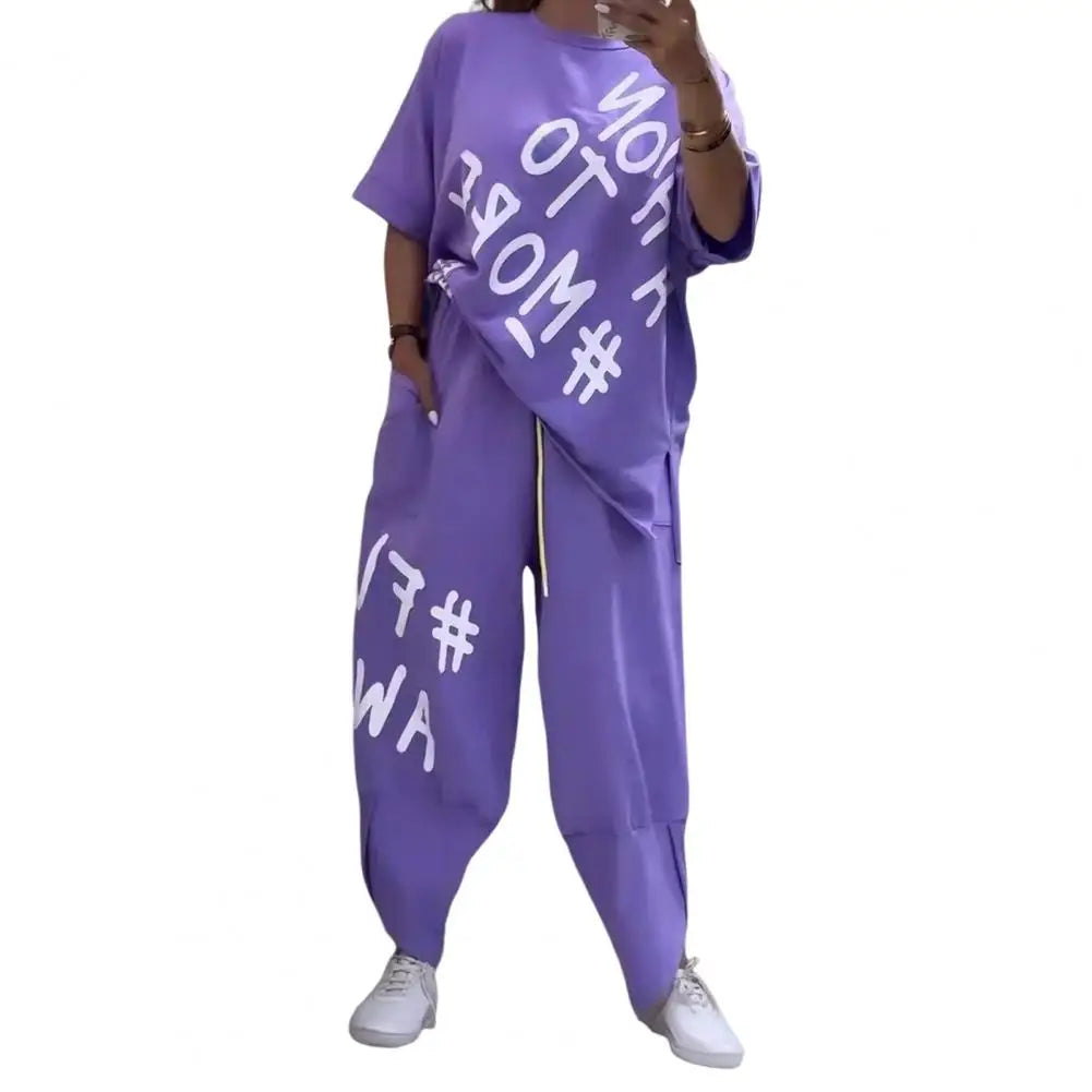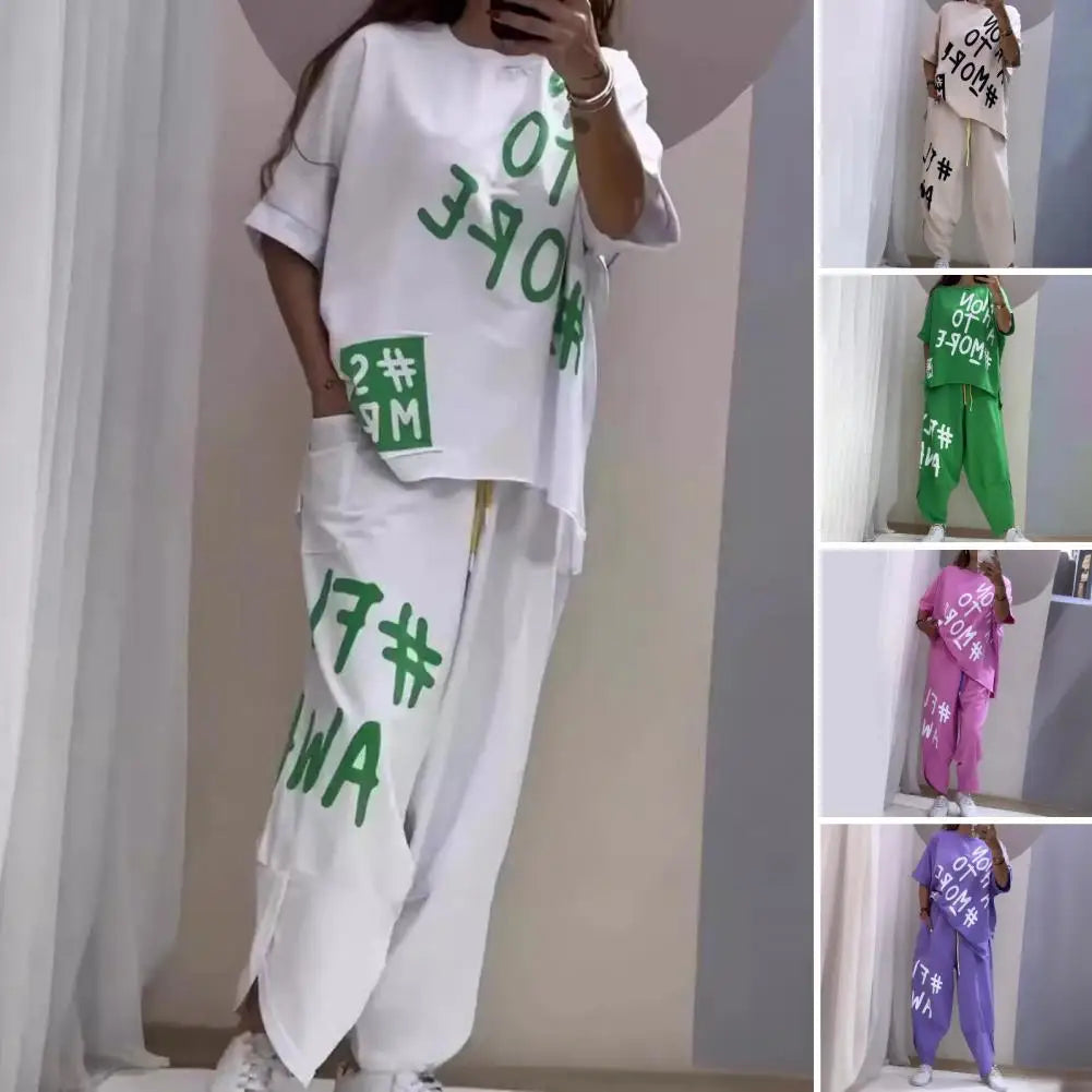 2Pcs/Set Women Summer Outfit O-Neck Short Sleeve T-shirt Waist Ties Pockets Harem Pants Set Letter Print Casual Tracksuit