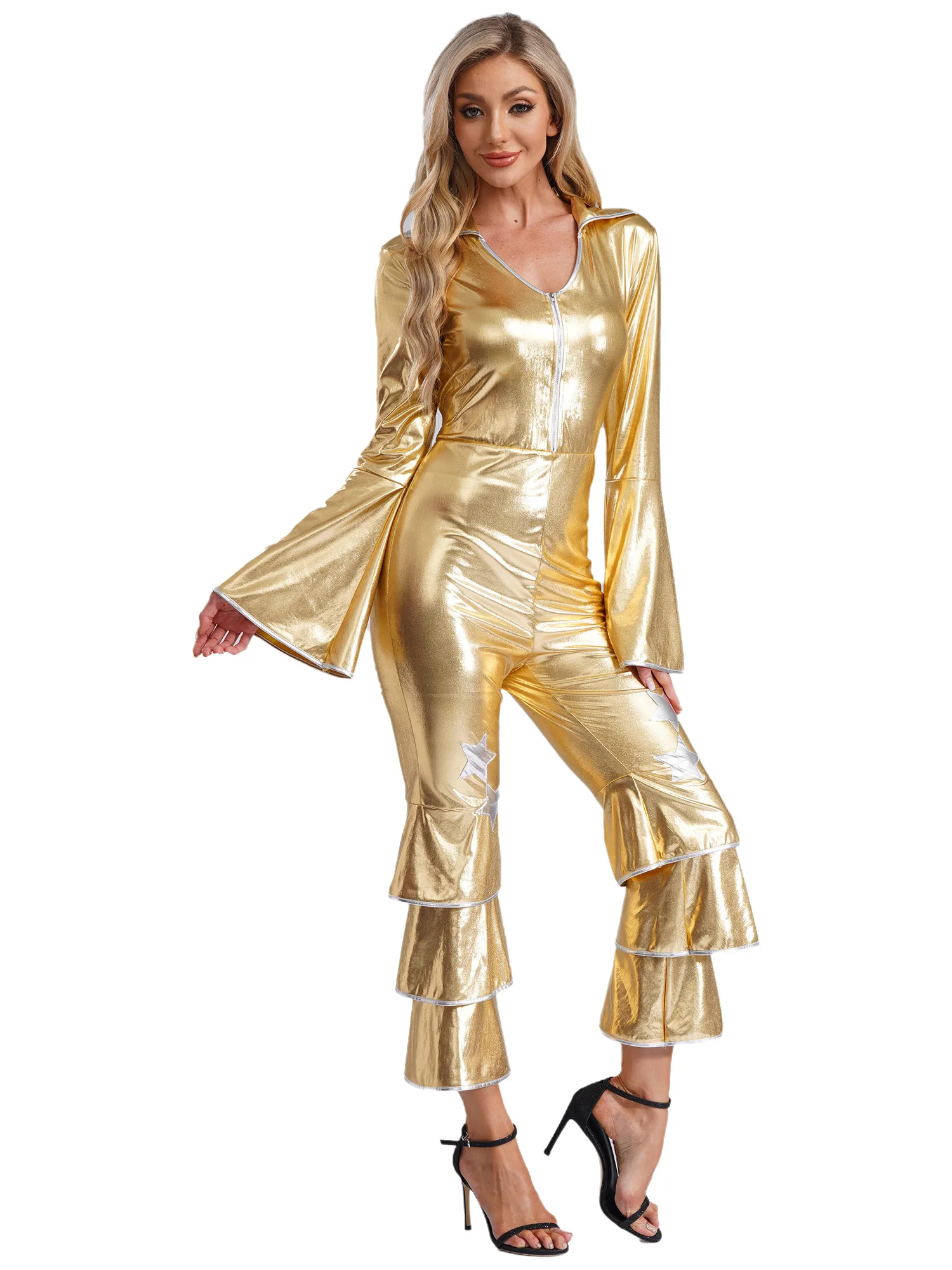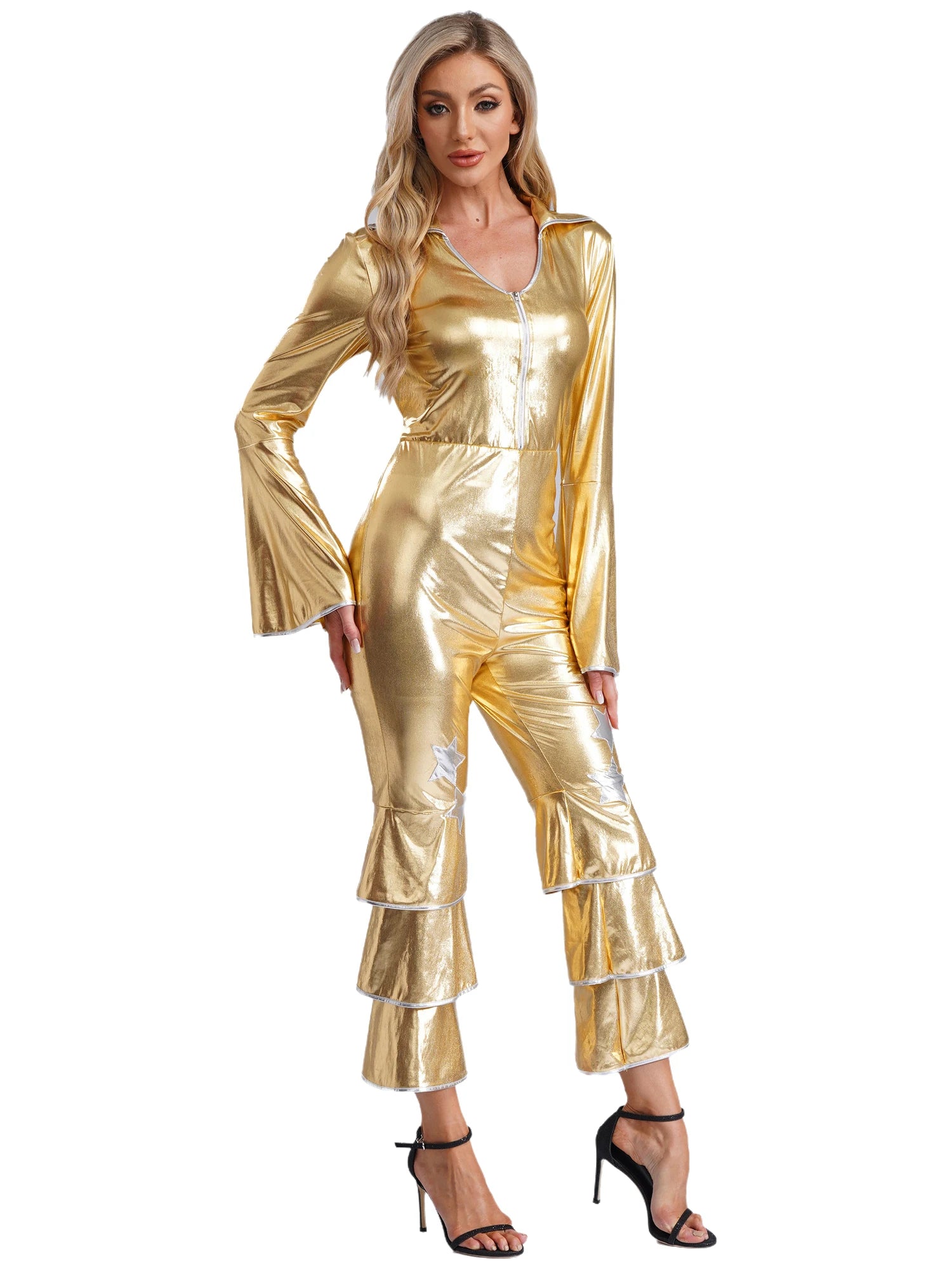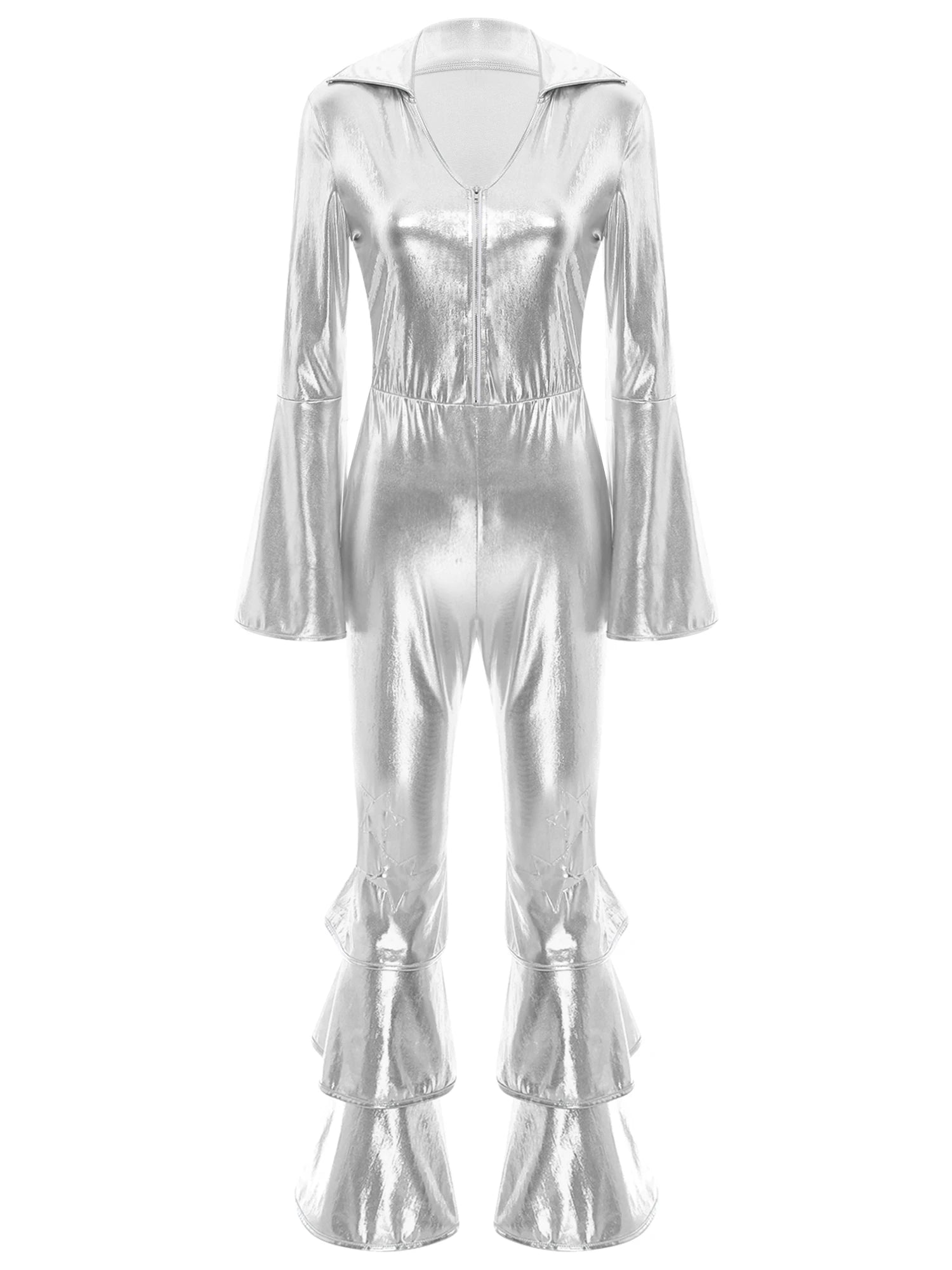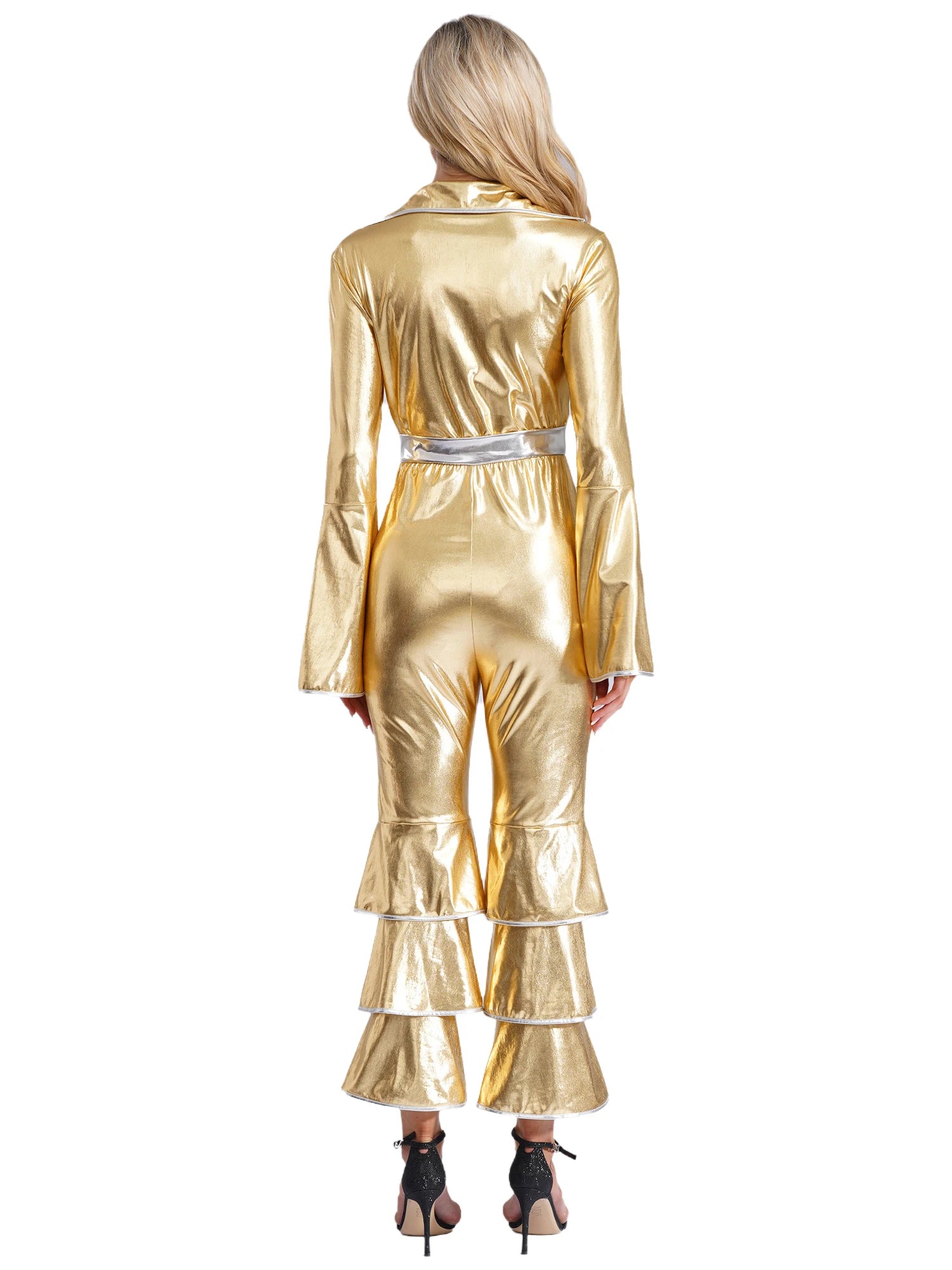 A 1970s disco dance costume for women, shiny fabric with metallic sheen makes you more eye-catching at parties.