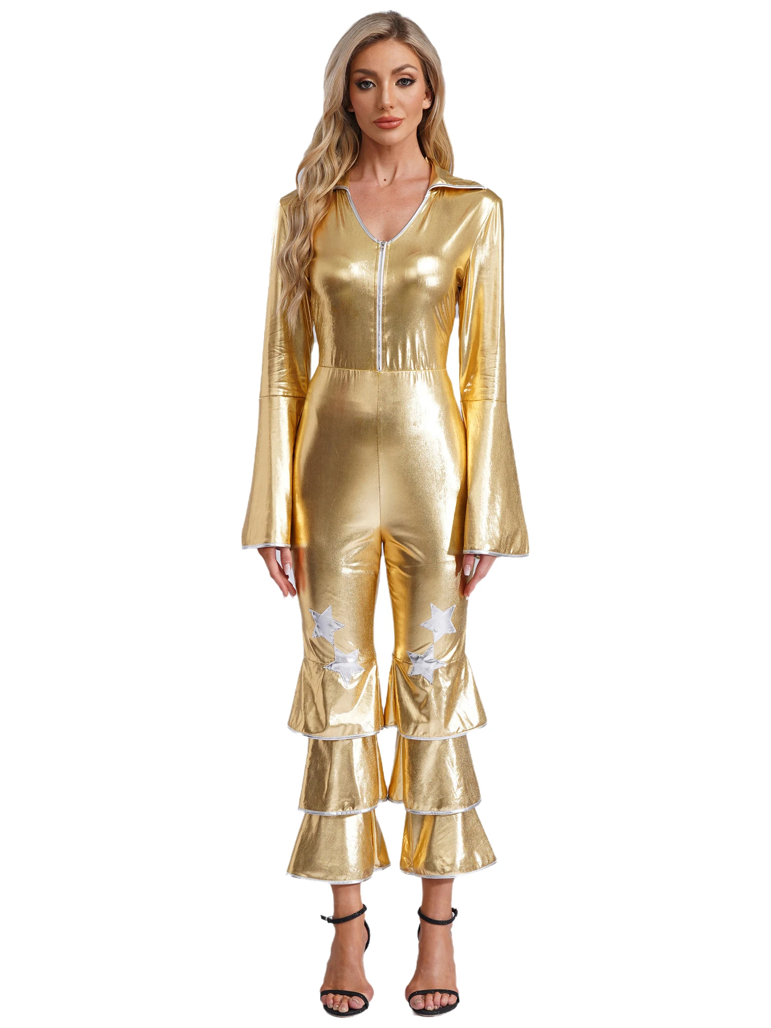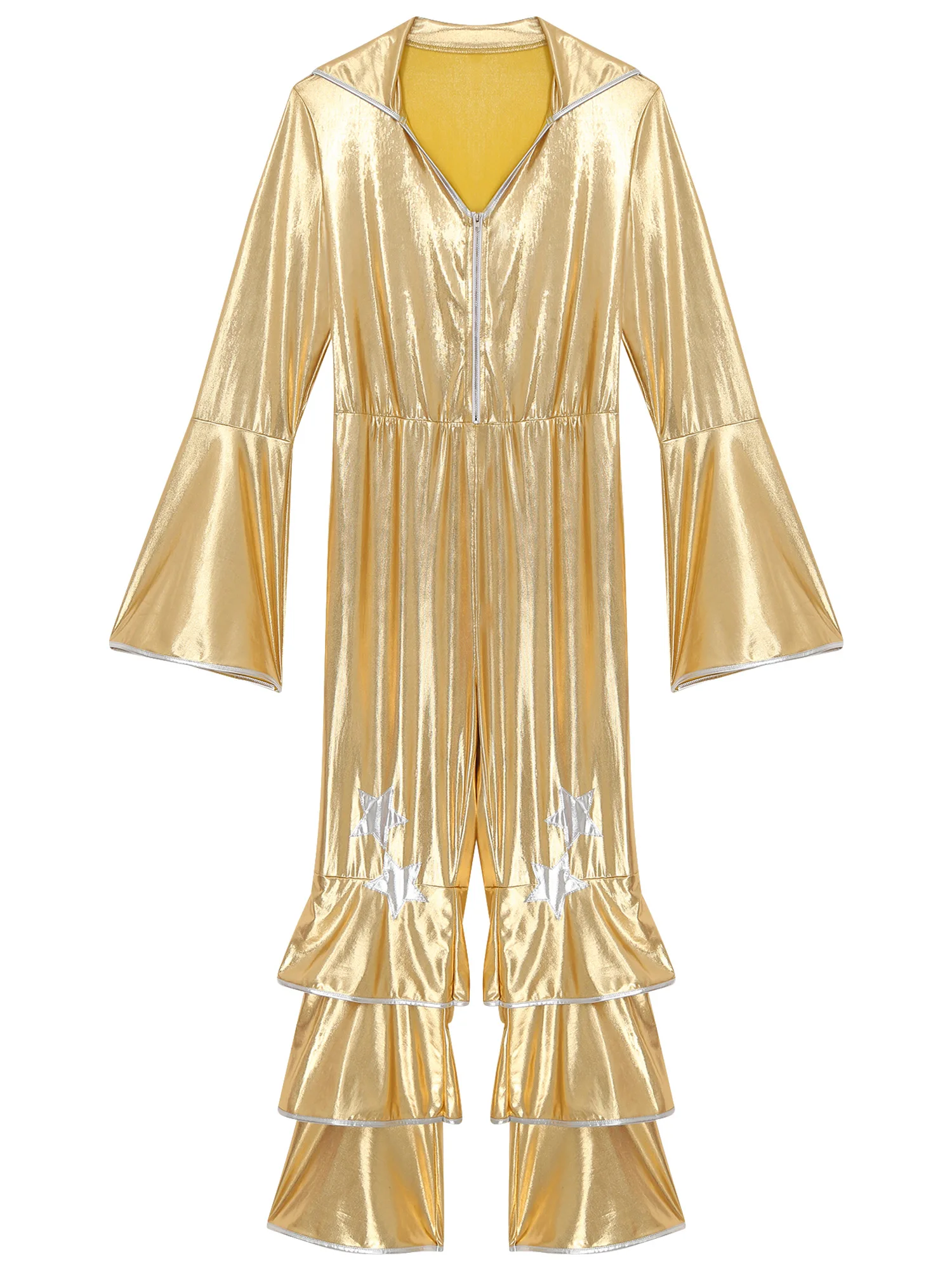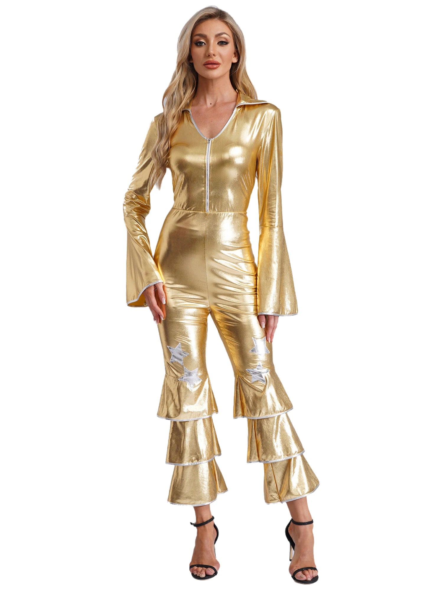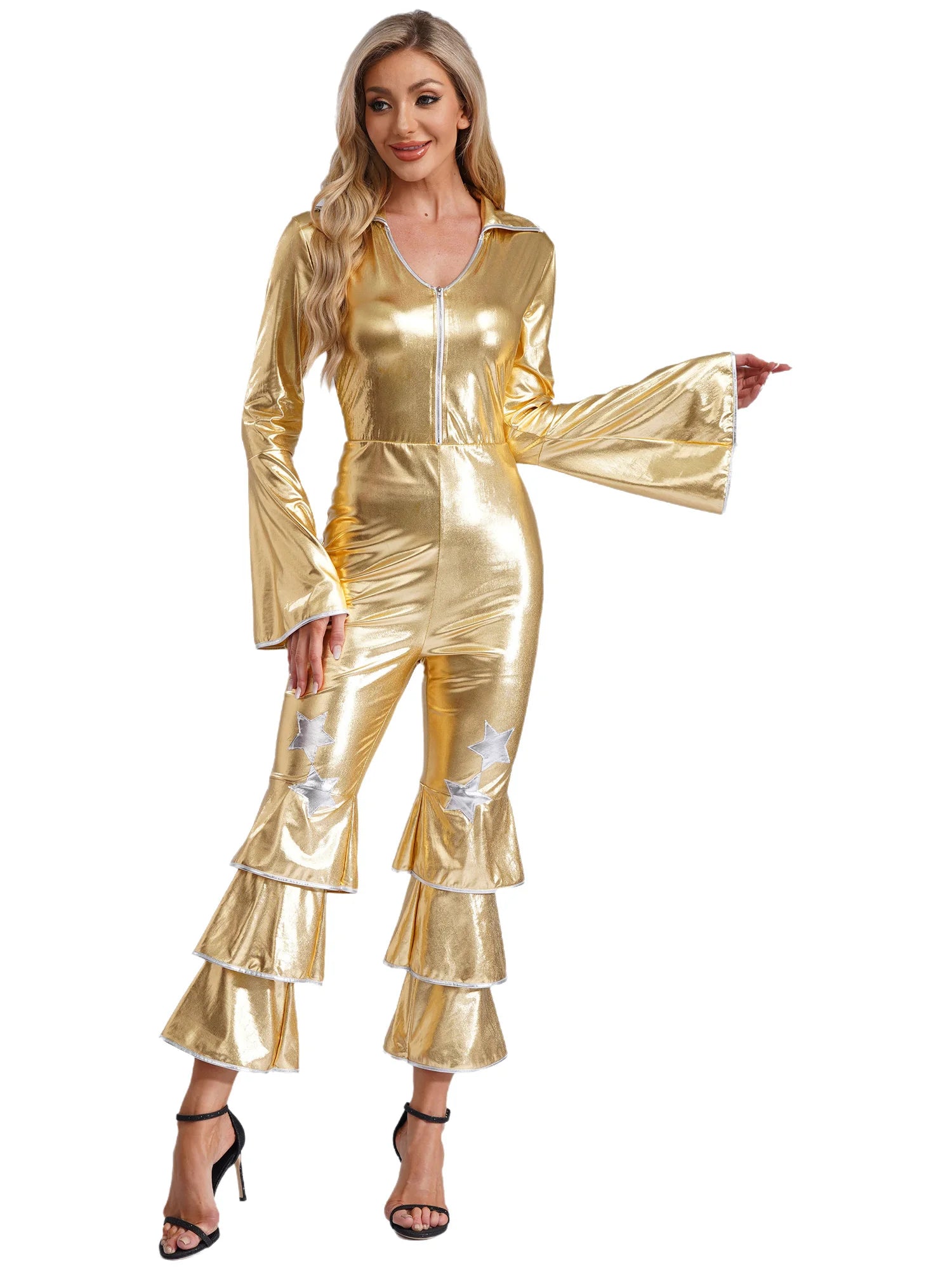 A 1970s disco dance costume for women, shiny fabric with metallic sheen makes you more eye-catching at parties.