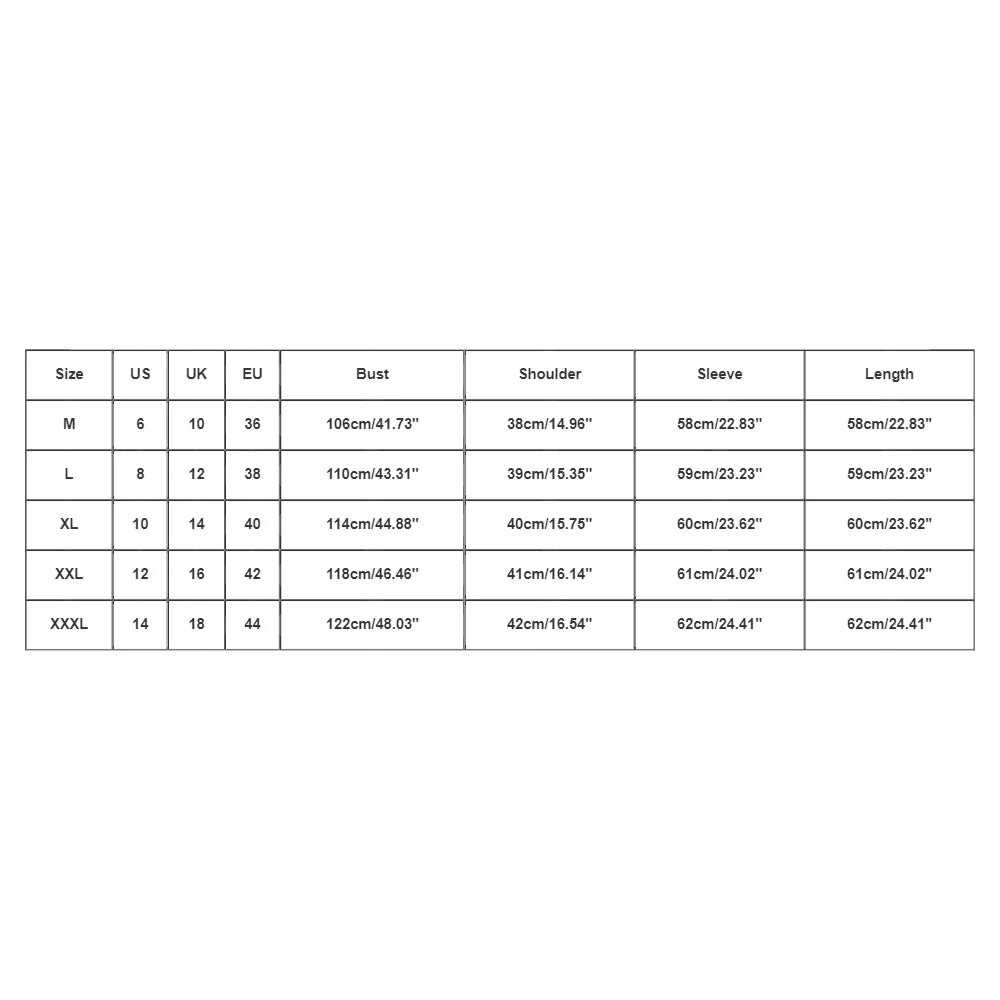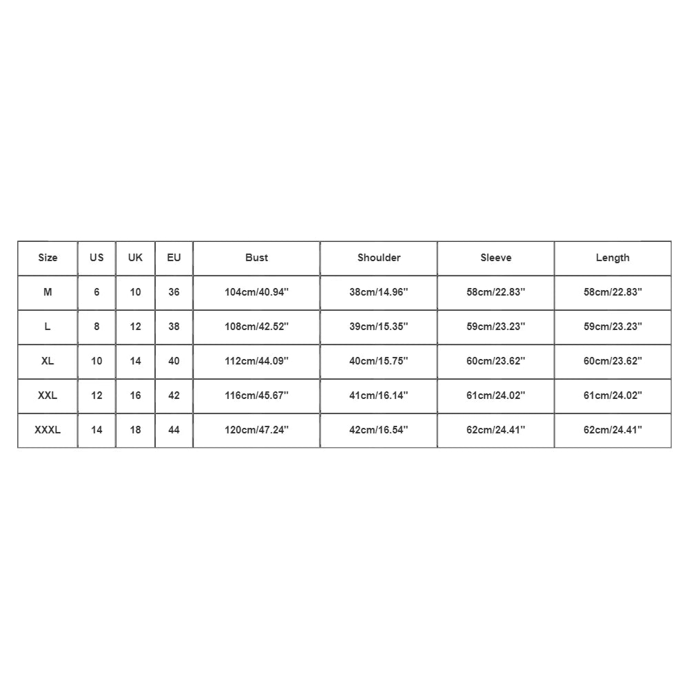 Size:XXXL | US:14 | UK:18 | EU:44 | Bust:122cm/48.03'' | Shoulder:42cm/16.54'' | Sleeve:62cm/24.41'' | Length:62cm/24.41'' |